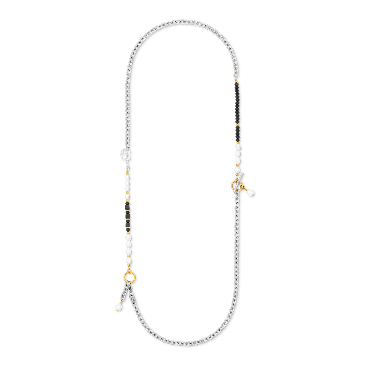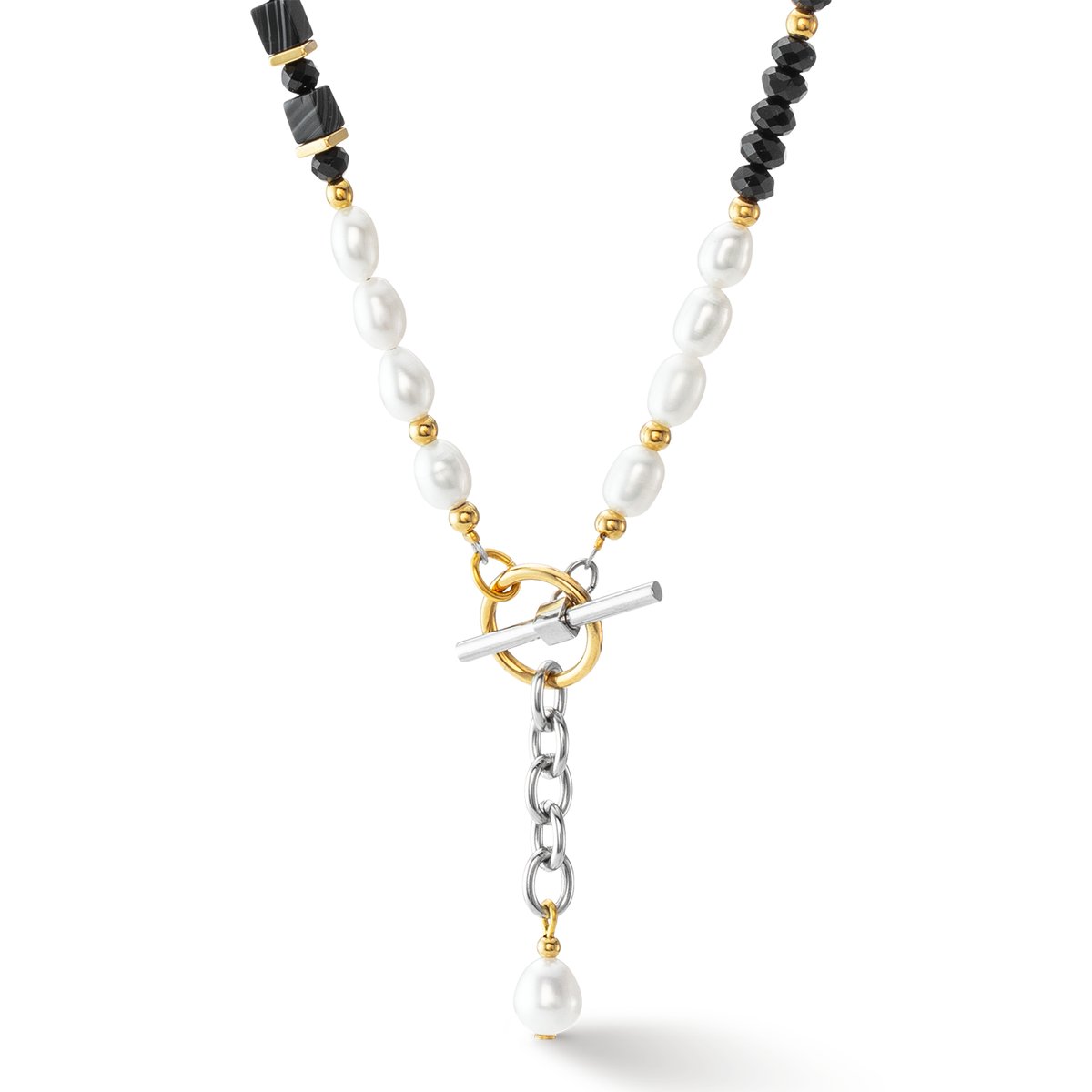 Art Deco Elegance necklace bicolour — Versatile Art Deco luxury The Art Deco Elegance necklace bicolour from the Multi-Wear range combines classic elegance with modern versatility. This sophisticated necklace combines oval freshwater pearls, striking striped onyx cubes and sparkling black crystal beads, which are stylishly complemented by gold accents. The bicolour look, rounded off by a silver chain with an integrated COEUR DE LION logo, gives the piece of jewellery a special touch. With its elegant toggle clasp, the necklace is not only easy to handle but also versatile: the matching bracelet can be easily attached to the necklace to create a long, round version. A versatile piece of jewellery that is perfect for any occasion. An essential accessory for lovers of the Art Deco style.