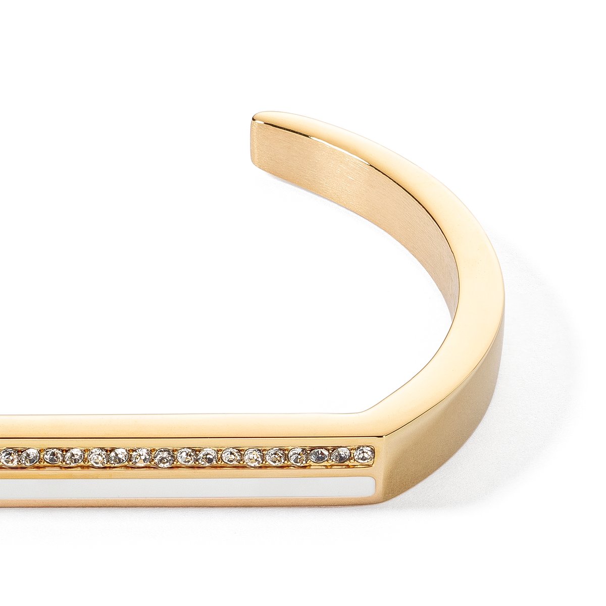 This cuff bangle has a modern design which is hallmarked by clear lines and geometric patterns. The combination of gleaming gold and bright white gives it a unique, striking look. Whether you wear it for formal occasions or every day, this bangle is sure to turn heads. Available in two sizes.