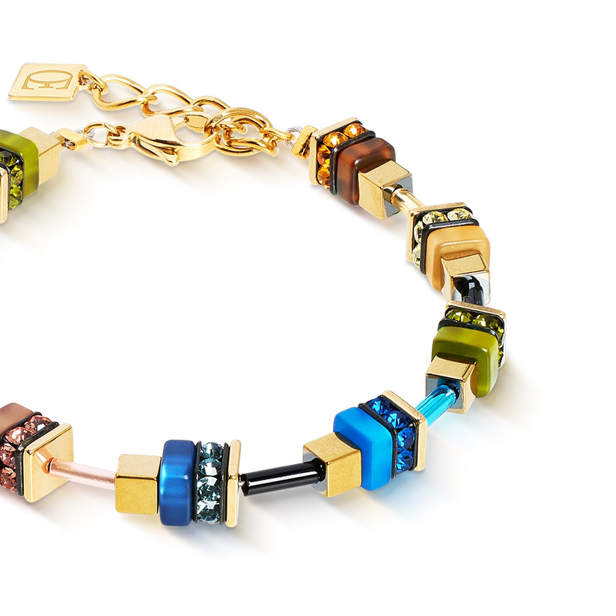 The Autumn Glow Cube multicolour bracelet brings the luminous diversity of autumn directly to your wrist. Inspired by the classic GeoCUBE® models, it combines polaris elements, crystals, refined haematite and gold-coloured stainless steel to create a harmonious unit. Warm brown and gold tones merge with intense blue and green tones to create a vibrant, autumnal play of colours. Modern, elegant and versatile — this bracelet is a colourful eye-catcher that adds a special touch to any outfit.