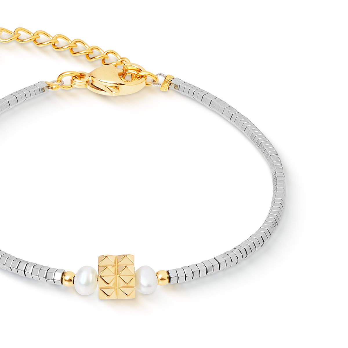Shines discreetly, looks powerful: the Edge & Grace bracelet combines a cool silver tone with warm gold and adds just the right amount of edge with the spiked cube in the centre. The shimmering freshwater pearls provide a stylish finish. Ideal for anyone who likes things pared down but still special.