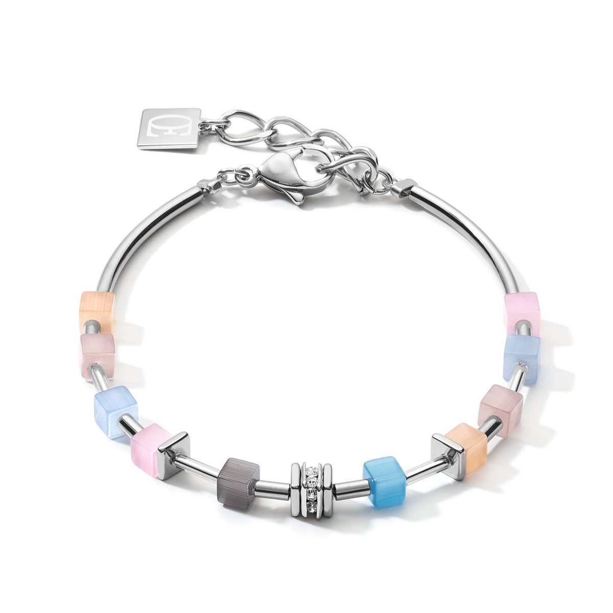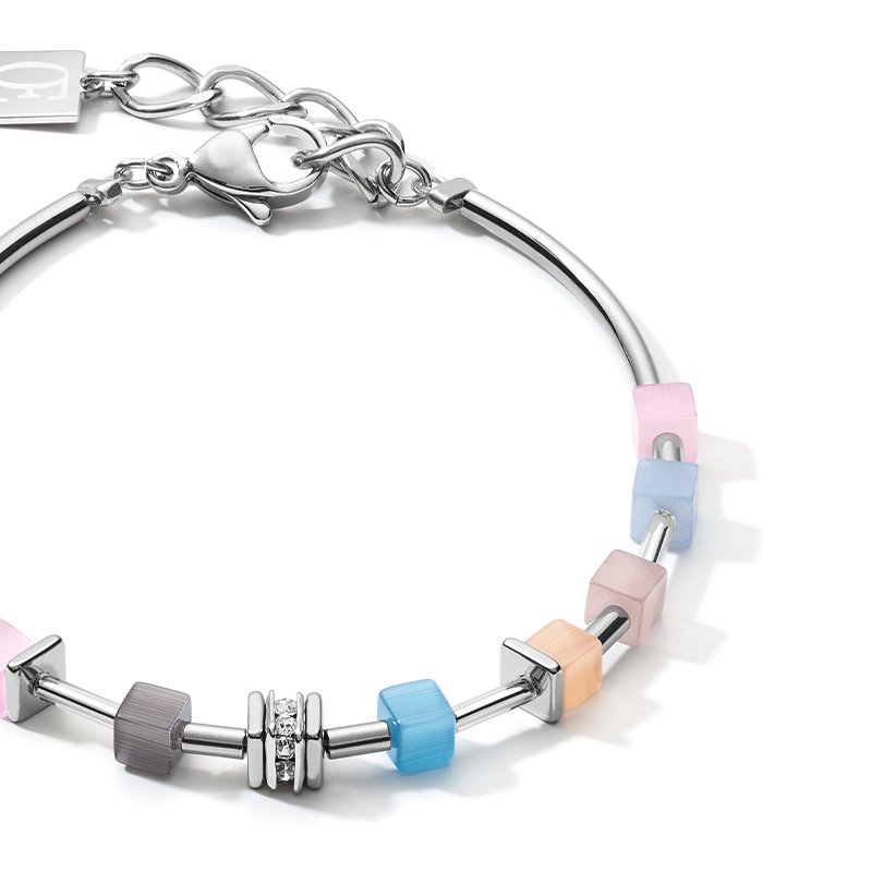 This delicate design presents fine GeoCUBES® in pastel shades made from haematite, crystal glass and Swarovski® crystals. Handmade at our studios.