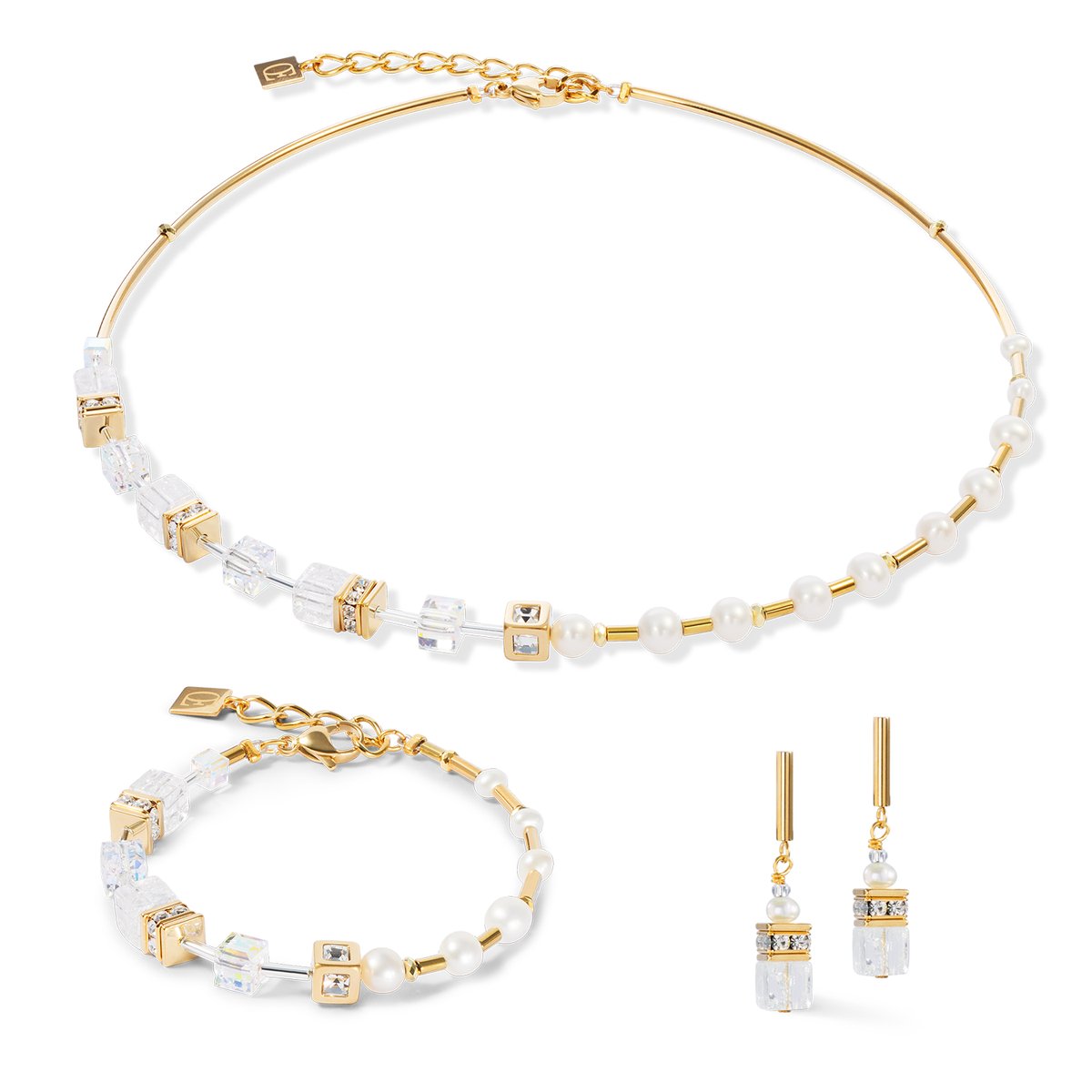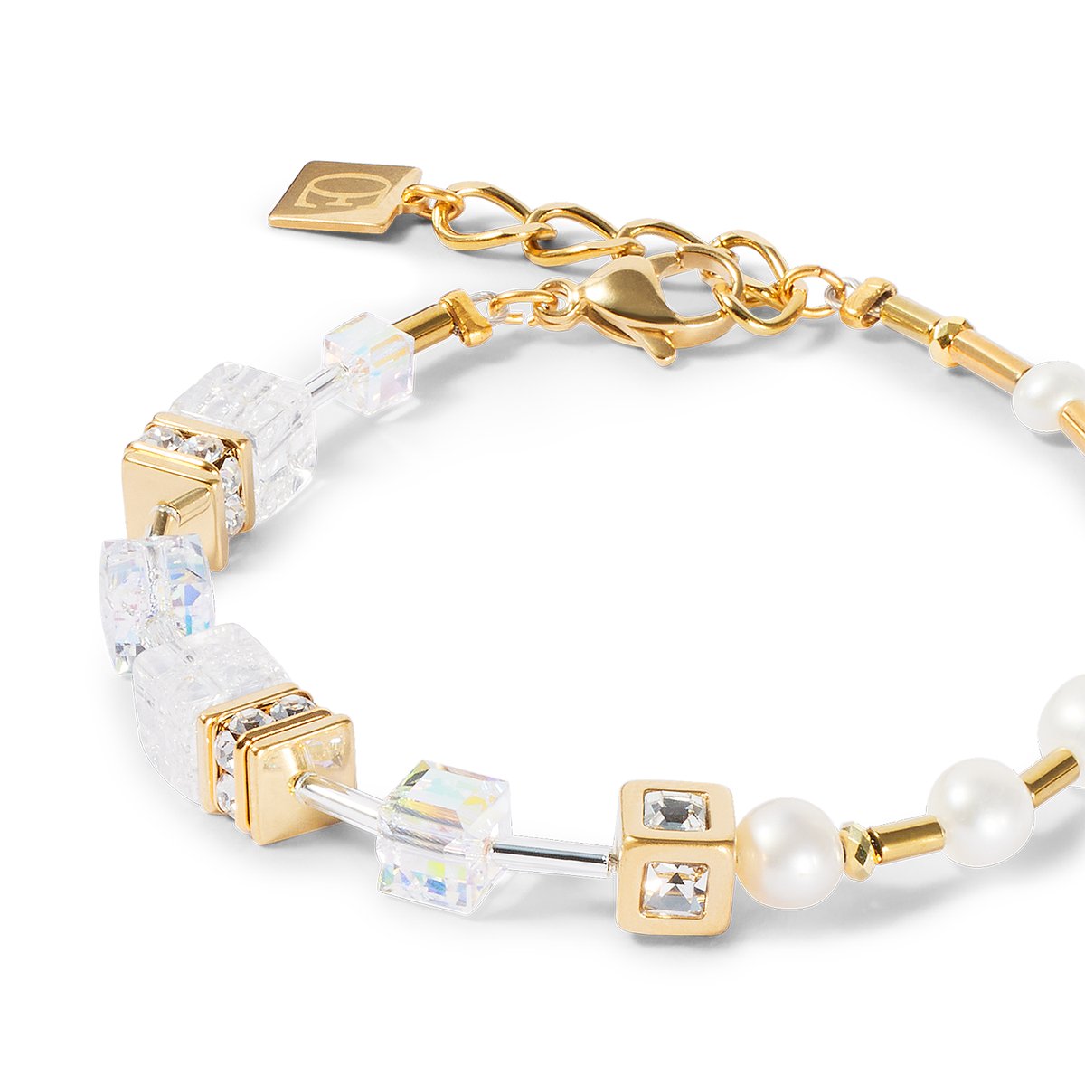 Asymmetrical beauty meets precious materials – the bracelet GeoCUBE® Fusion Precious Pearl Mix gold-white combines precisely cut Swarovski crystals, radiant rock crystal and delicate freshwater pearls in a unique composition. The gold-coloured elements made of stainless steel gold create a modern, elegant look. A stylish accessory for special moments – whether as a subtle eye-catcher or as the perfect piece of jewellery for a wedding.