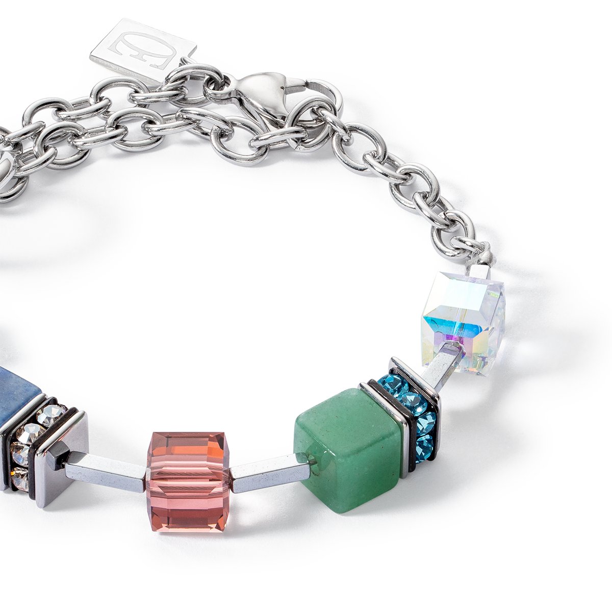 A bold and innovative reinterpretation of a famous design: iconic GeoCUBE® in a new size made from colourful natural stones, combined with chunky chains to create an exciting statement bracelet. Don’t miss the matching multiwear necklace. The bracelet can even be incorporated as part of the necklace.