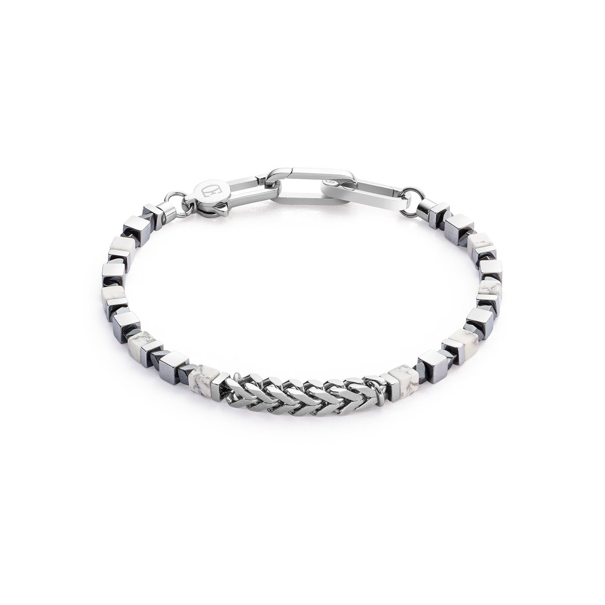 The Precious Cubes & Chain bracelet in white and silver is a masterpiece of minimalist design. Smooth howlite cubes and shimmering haematite with a titanium oxide finish play with the sophistication of a braided stainless steel chain. This piece of jewellery is the epitome of understated elegance and perfect for the man who appreciates the finer things in life.