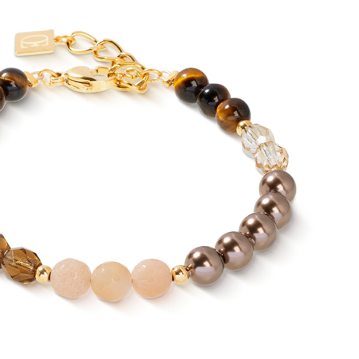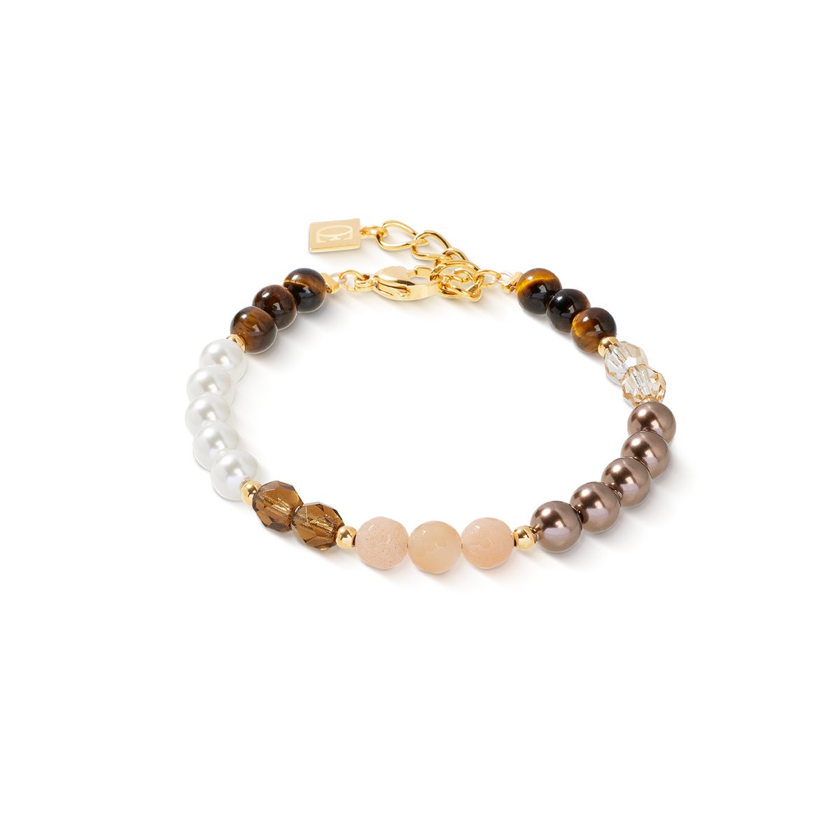 The Precious Elysia gold-brown bracelet combines precious natural stones such as tiger’s eye and sunstone with shimmering Crystal Pearls by Swarovski® and sparkling Swarovski® crystals. The gold-plated stainless steel not only gives the bracelet its elegant look, but also makes it particularly durable. The soft colour composition of brown, gold and cream adds a touch of elegance to any outfit and makes this bracelet the ideal everyday companion.