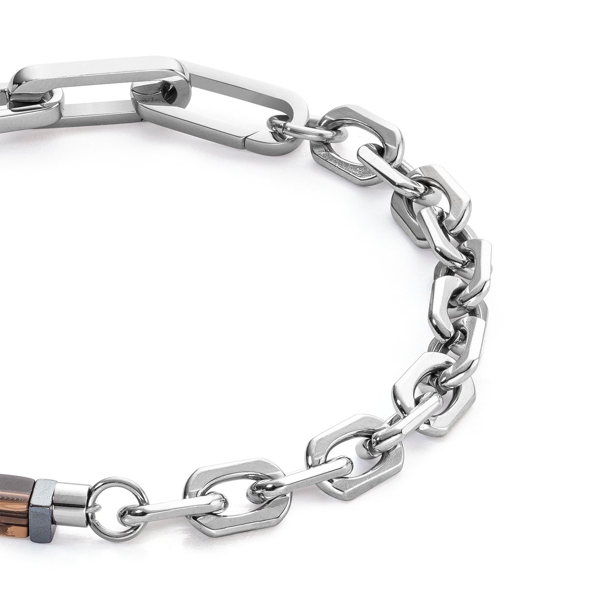 The earthy look of the Precious Fusion link chain in brown-silver is unmistakable. The smoky quartz cubes create a subtle, grounding presence, which is further enhanced by the metallic shimmer of the haematite with a titanium oxide finish. The stainless steel link chain adds a modern touch, while the asymmetrical design creates a balance between naturalness and technology.