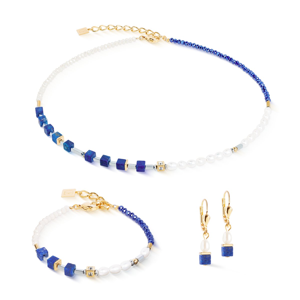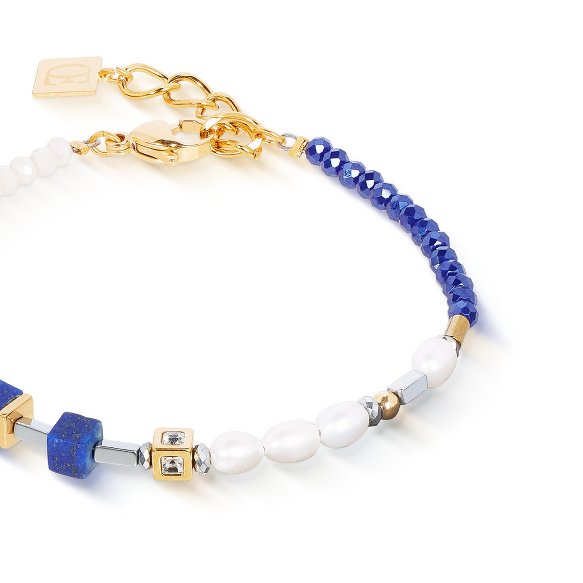 As versatile as your style: this bracelet combines natural materials such as lapis lazuli and freshwater pearls with geometric accents in gold-coloured stainless steel. The intense colour of the blue stone brings freshness and depth to the design, while the finely crafted clasp ensures optimum wearing comfort. Worn alone or in combination with the matching necklace and earrings, it creates a harmonious look — expressive but never overpowering.