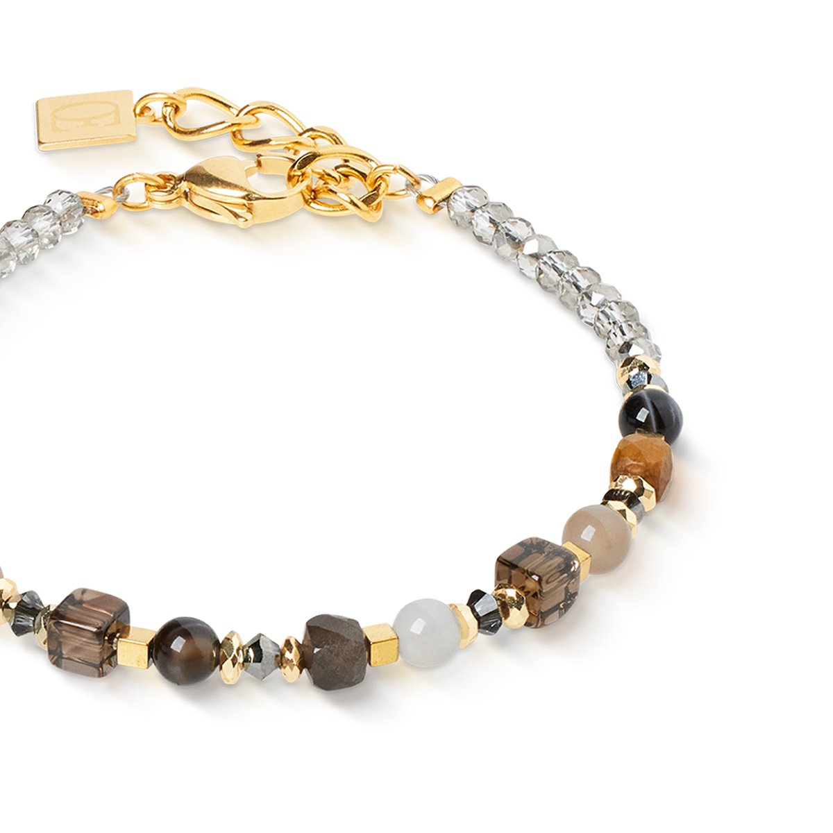 The Shape Mix Spikes Smoky Glow bracelet combines the elegant colours of tiger’s eye, smoky quartz, chocolate moonstone, agate and striped onyx with the sparkling reflections of Swarovski® crystals. Gold-plated stainless steel sets modern accents and provides an elegant finishing touch. The harmonious interplay of warm brown tones makes this bracelet a versatile accessory that enhances any look — from elegant to casual.