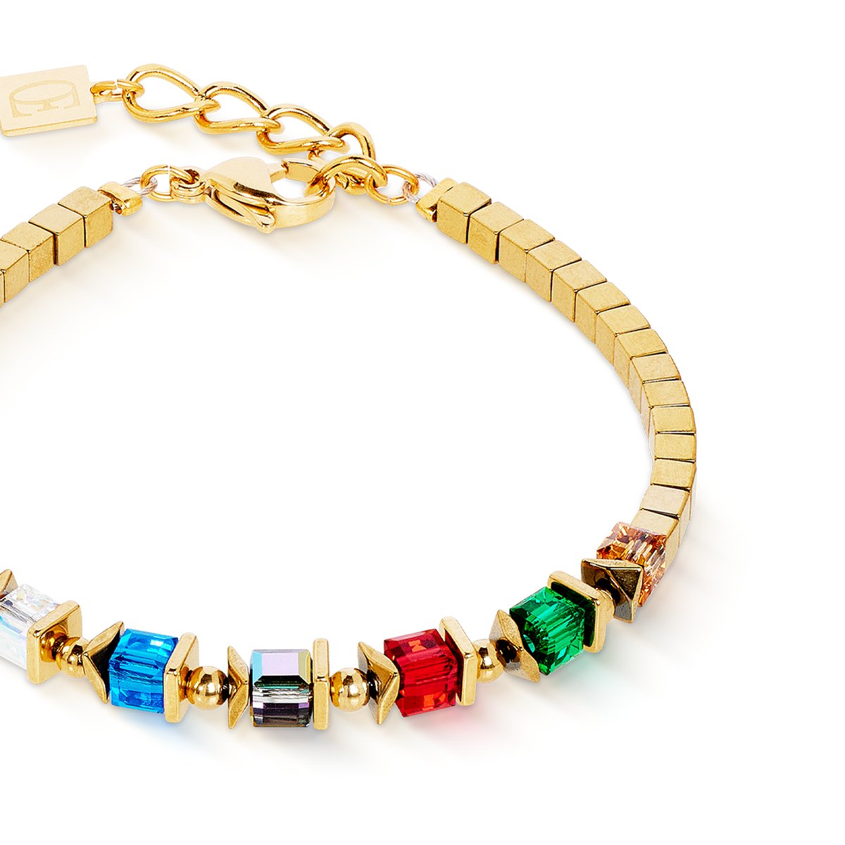 This bracelet brings the Sparkling Moments colour trend to your wrist — with a powerful mix of Swarovski® crystals in multicolour, shiny gold-plated stainless steel and accentuating hematite cubes. The mix of colours and clear shapes makes the design particularly versatile — for looks with charisma.