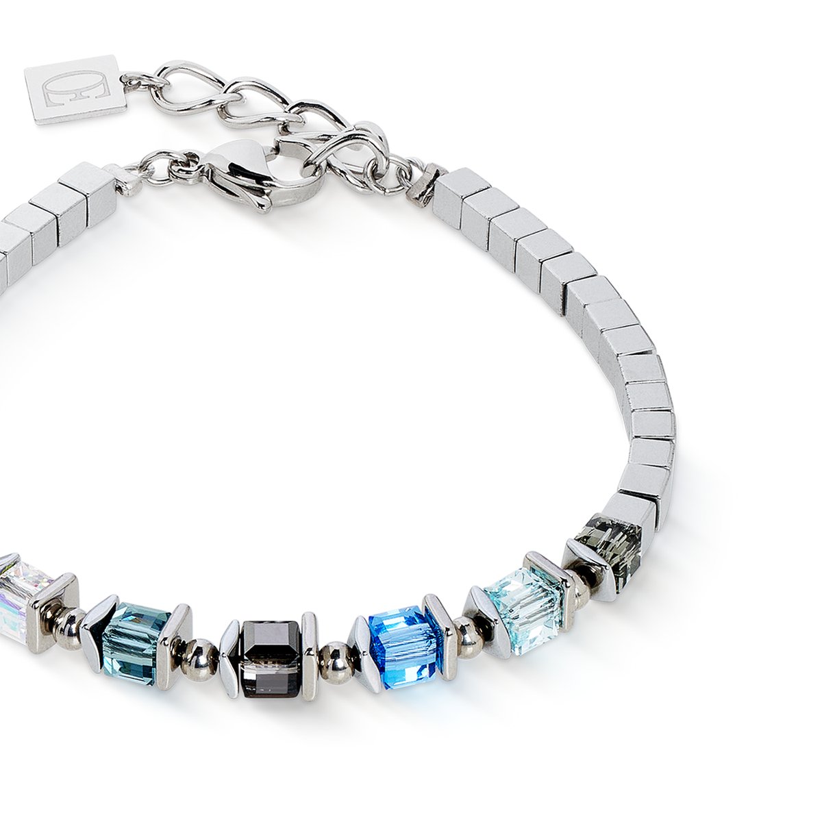 Compact, clear and full of radiance — the bracelet from the Sparkling Cubes Fusion Chain series combines elegant stainless steel in a silver look with sparkling Swarovski® crystals in shades of blue and aqua. Haematite cubes with a titanium oxide finish add texture and depth to the design. Inspired by the Sparkling Moments trend theme, the result is a piece of jewellery for every day with the wow factor.
