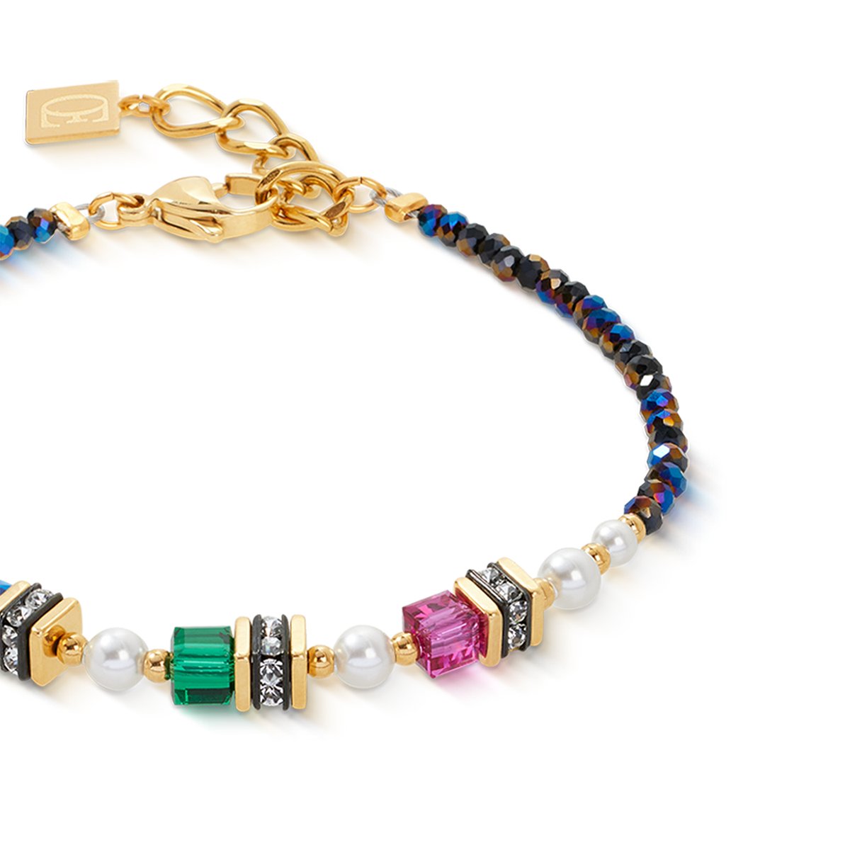 Delicate sparkle with a royal touch The Sparkling Princess couture bracelet is a delicate companion that delights with its balanced colour composition. Crystal Pearls by Swarovski® in delicate white frame Swarovski® crystals in blue, green and pink, which together with gold-coloured elements and sparkling crystals create a vibrant interplay of colours. The filigree shape makes the bracelet a subtle but effective accent that enhances everyday looks as well as stylishly complementing festive outfits.