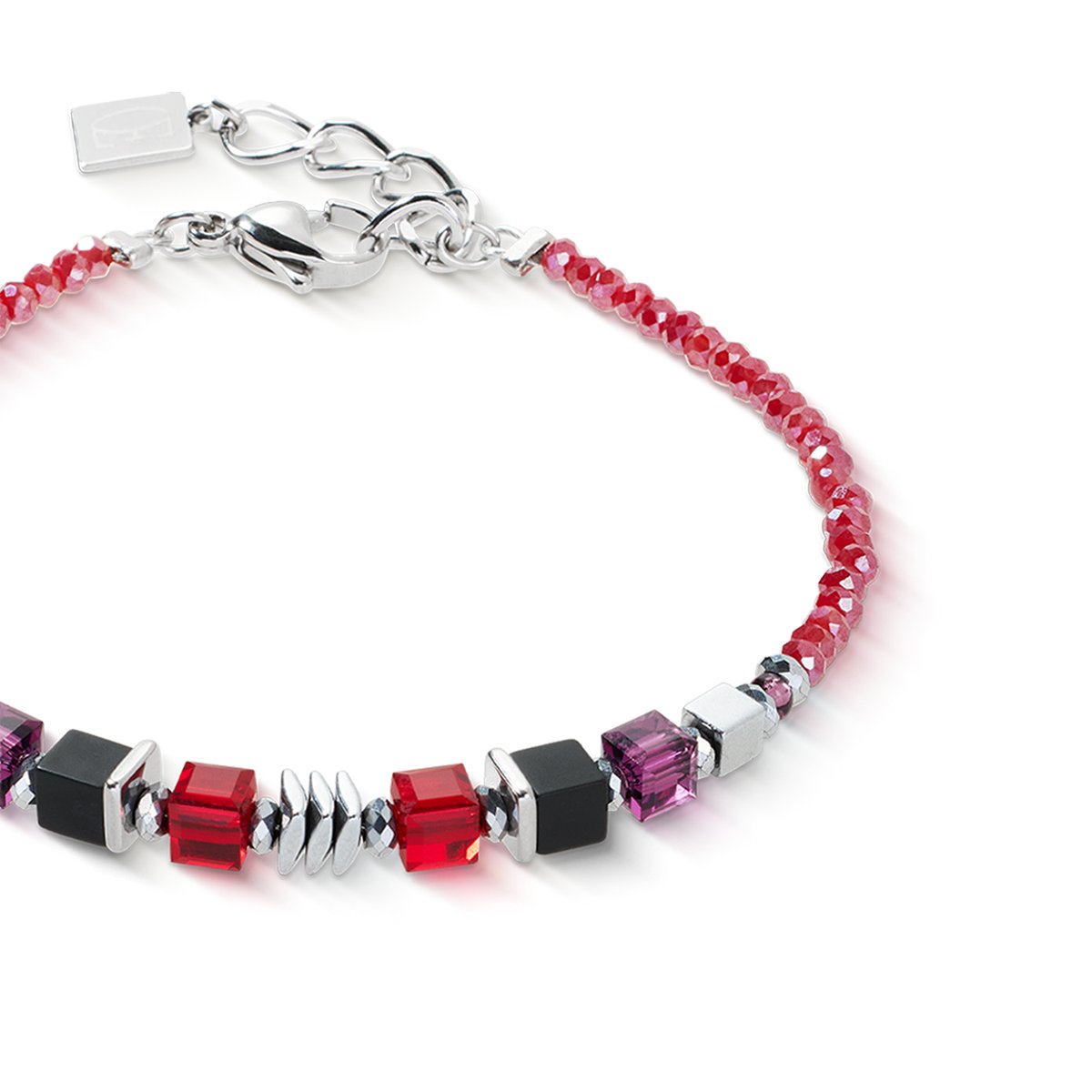 At the centre of this design are graphically clear wave elements made of hematite, embedded between deep red Swarovski® crystals, dark onyx and shiny stainless steel. Framed by fine, sparkling glass beads, a harmonious colour gradient is created with stylish lightness. A bracelet that can be effortlessly combined — like all COEUR DE LION jewellery, carefully crafted and handmade in Germany.