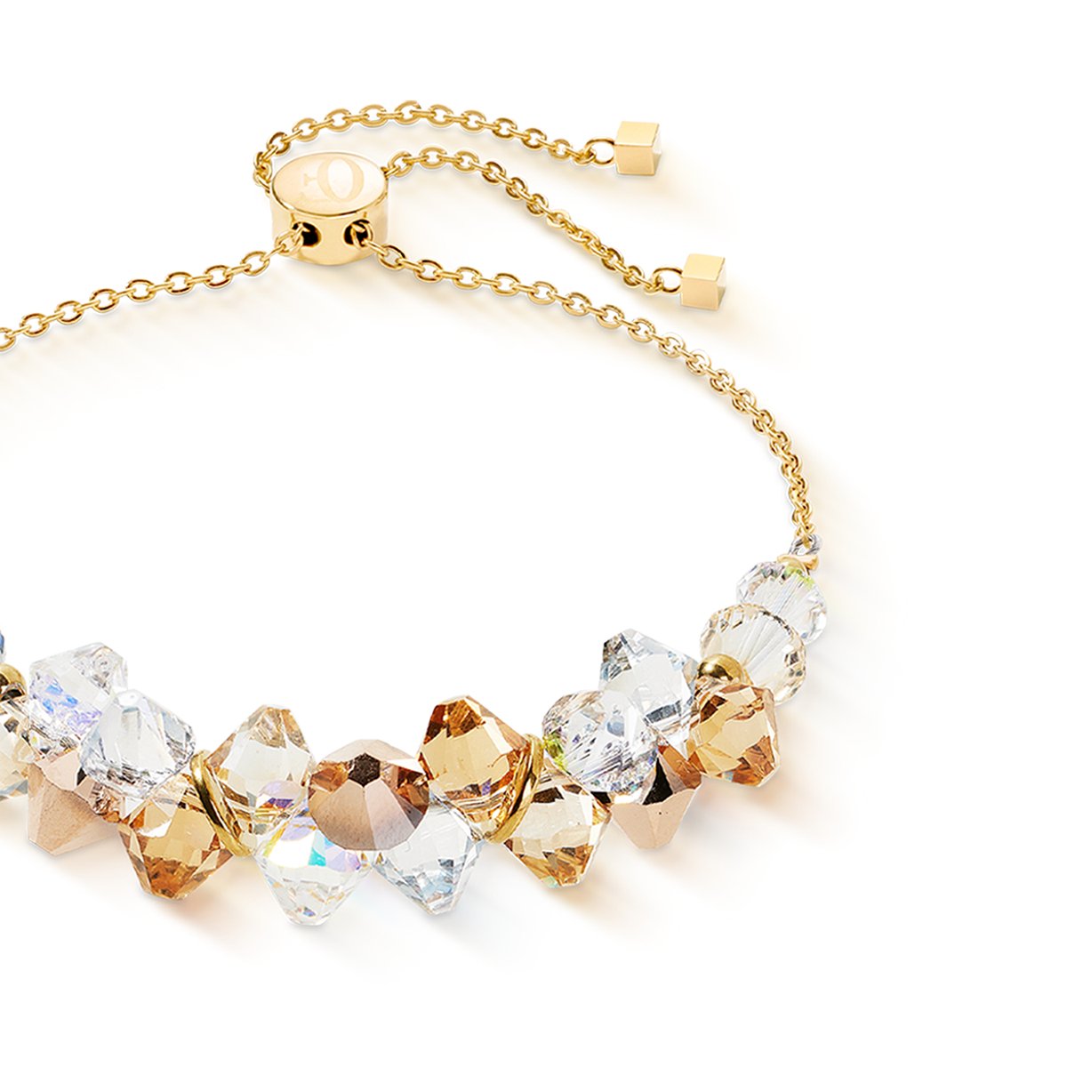 Dancing Crystals bracelet gold-beige — glittering elegance on the wrist The Dancing Crystals bracelet in gold-beige combines delicate lightness with sparkling radiance. Swarovski® crystals in shimmering shades of beige and clear nuances create luminous highlights that seem to dance with every movement. The fine stainless steel chain in gold creates an elegant contrast and makes the bracelet feel light and airy to wear. Thanks to the sliding clasp, the bracelet is individually adjustable and fits every wrist perfectly. A feminine eye-catcher that enhances everyday looks and rounds off festive outfits with sparkling sophistication.