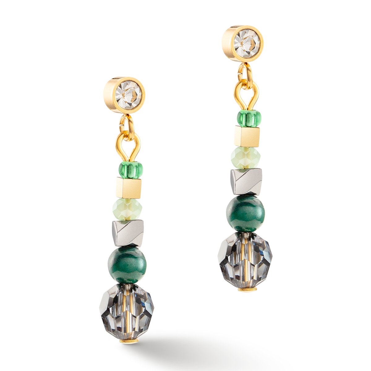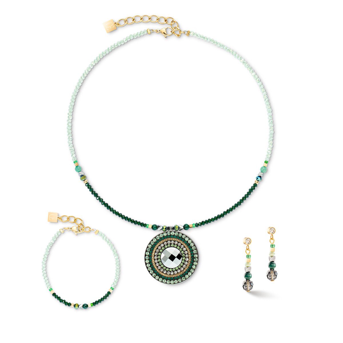 The Glamorous Green amulet earrings in gold will make you look elegant with their sparkling crystals and delicate precious stones. They complement the matching necklace perfectly.