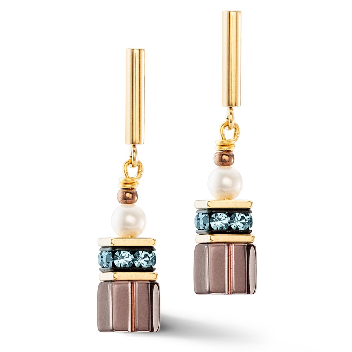 The GeoCUBE® Fusion Precious Pearl Mix Gold-Autumn earrings are a stunning piece of jewellery that will add a unique and glamorous touch to your look. These earrings combine the iconic GeoCUBES® made of brown smoky quartz with genuine freshwater pearls, creating a fascinating contrast.