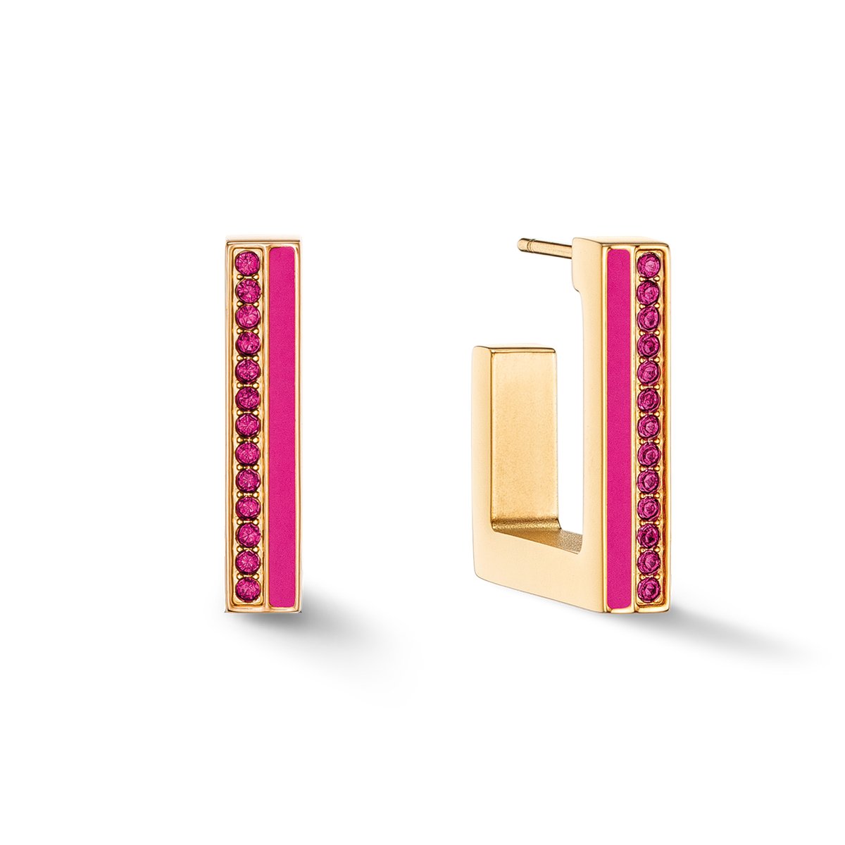 Are you ready for an eye-popping jewellery trend? Our square stainless steel hoops in gold and pink are an absolute must for all the fashion-conscious out there. With an exciting combination of vibrant crystals and coordinating coloured stripes, these earrings will give your outfit a fresh, modern look. Matching bangle and rings available.