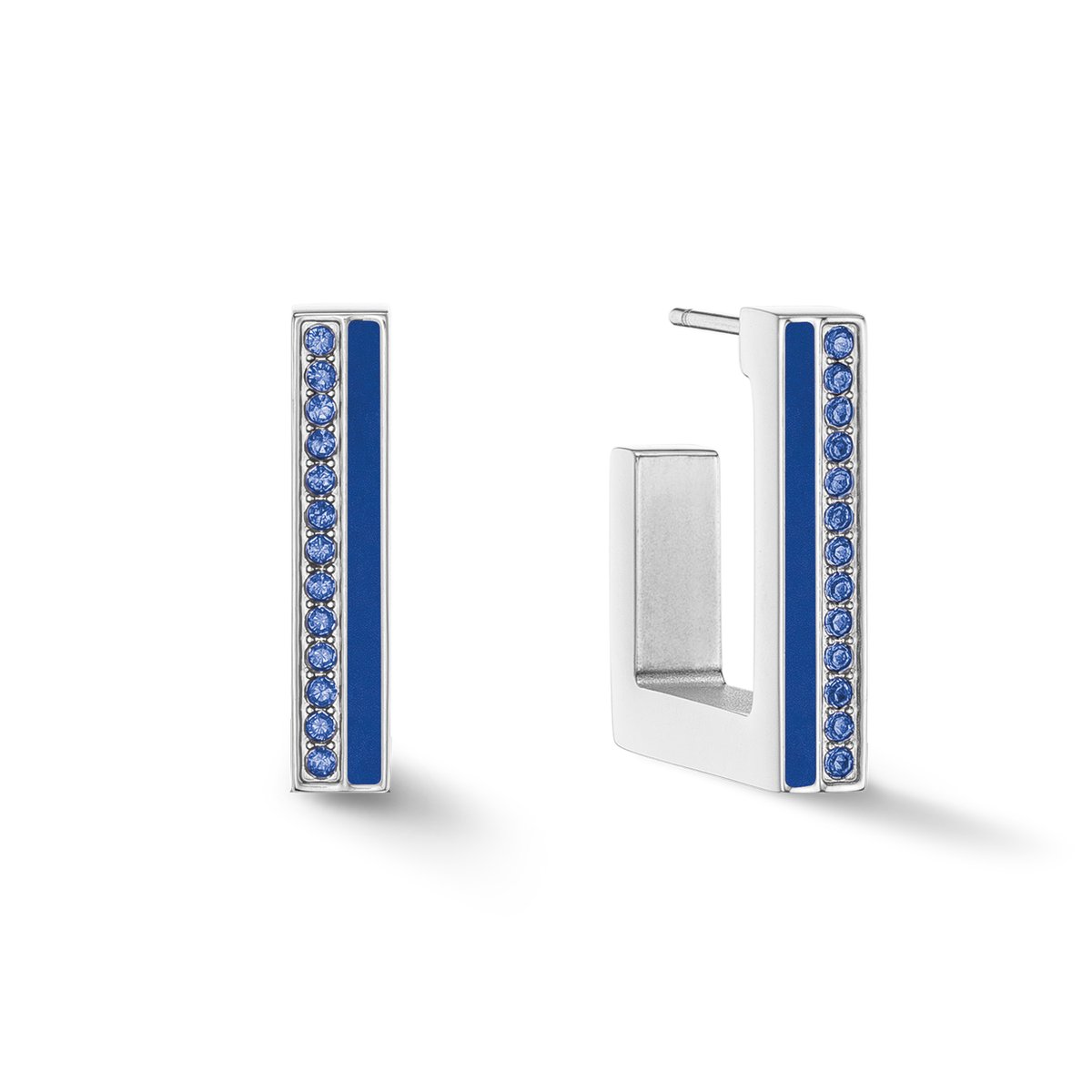 Are you ready for an eye-popping jewellery trend? Our square stainless steel hoops in silver and blue are an absolute must for all the fashion-conscious out there. With an exciting combination of vibrant crystals and coordinating coloured stripes, these earrings will give your outfit a fresh, modern look. Matching bangle and rings available.