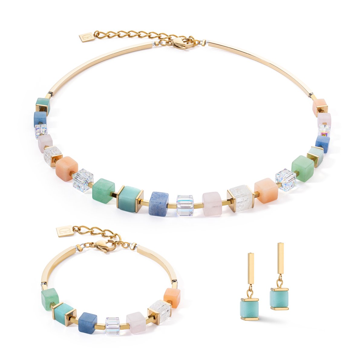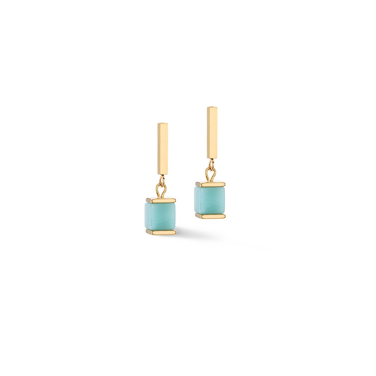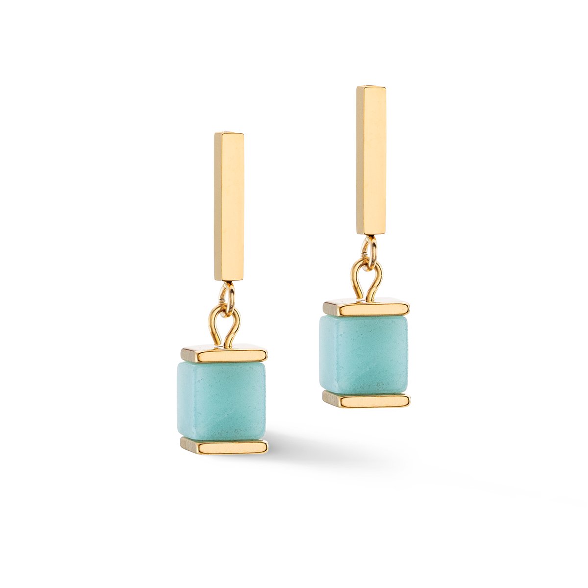 For real stone lovers. Make a statement with these 6 mm cube earrings. Here with luminous amazonite and shiny stainless steel gold. Earrings also match the Precious Classic Cubes necklace multicolour-gentle.