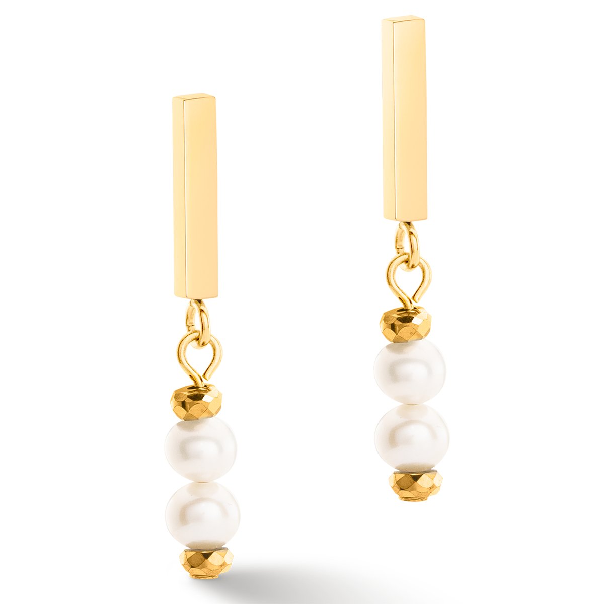 The gold Shape Shifter earrings with delicate freshwater pearl pendants can be worn for all sorts of occasions. They will add a subtle elegance to your everyday outfits and are the perfect accessory for special occasions, too. These stud earrings are great to mix and match. They can also be worn with other pieces from the Shape Shifter collection or different golden accessories.