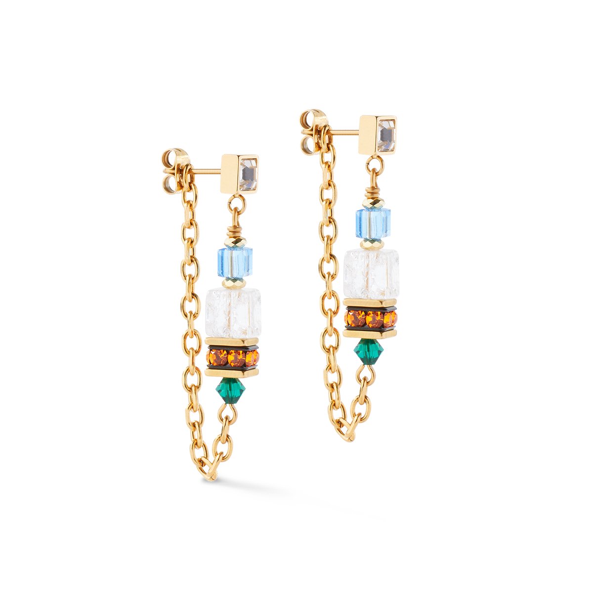 Sparkling movement — the Sunray Cube Couture gold multicolour earrings combine vibrant colours and playful elegance. Sparkling Swarovski® cubes and clear rock crystal cubes reflect the light with every movement, while fine chain details add a touch of extravagance. A stylish highlight that adds that certain something to any look!