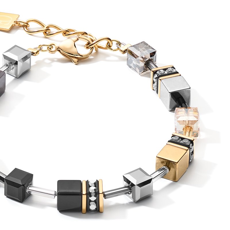 Bracelet made from gold-coloured stainless steel and natural stones in the famous GeoCUBE® design for an eye-catching, glamorous look.