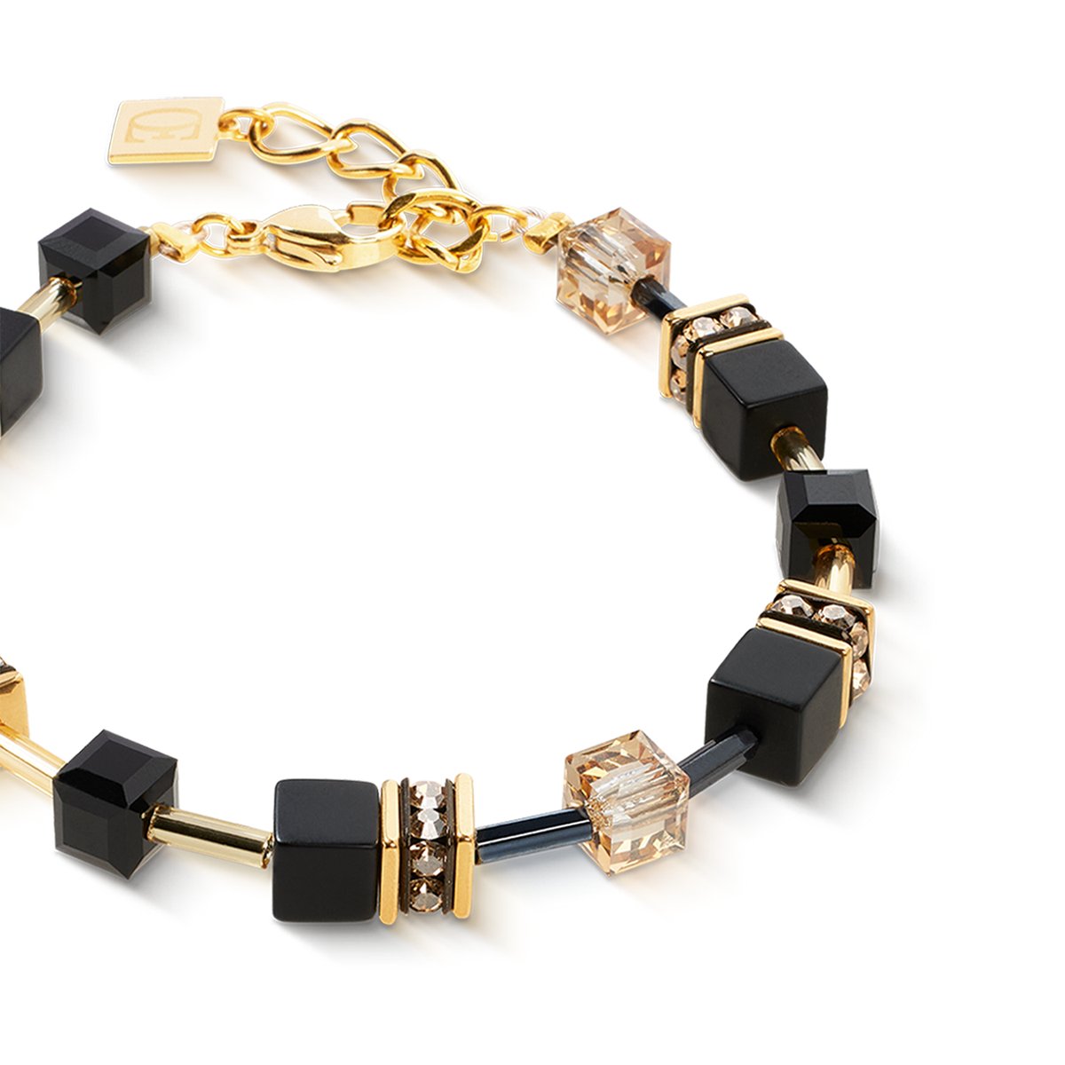 Minimalist in design, maximum in expression: the GeoCUBE® Onyx black-gold bracelet combines the natural strength of onyx with the elegant lustre of fine crystals. Gold-coloured stainless steel elements create elegant highlights and underline the graphic clarity of the design. This bracelet is just as powerful worn solo as it is in a set — a real power piece «Made in Germany».