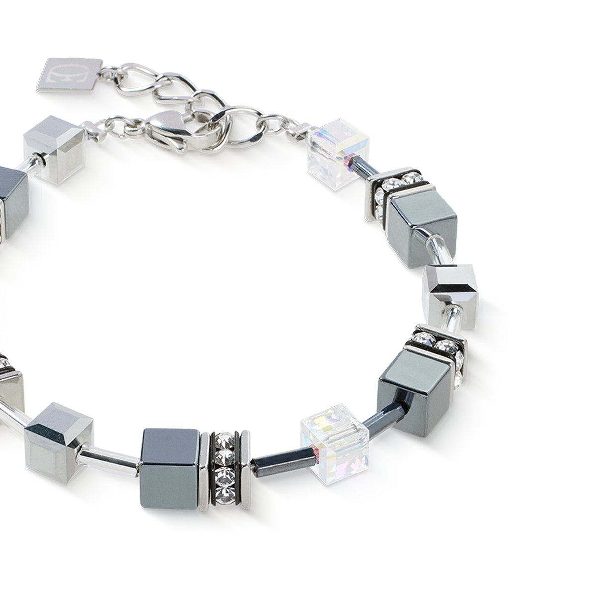The GeoCUBE® platinum bracelet is the perfect addition for modern minimalists. The cubic elements made of haematite and faceted crystals, set in cool stainless steel, create a clear, geometric look with elegant radiance. The light silver colour composition looks particularly sophisticated and makes the bracelet a stylish individual piece or part of a harmonious set.