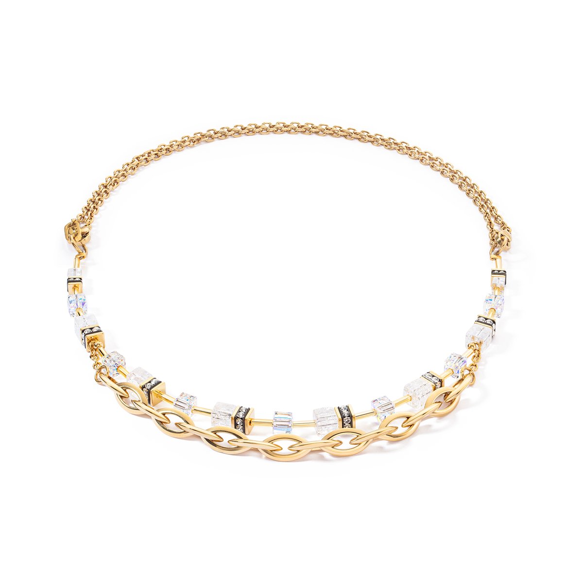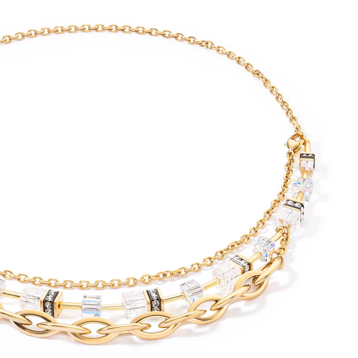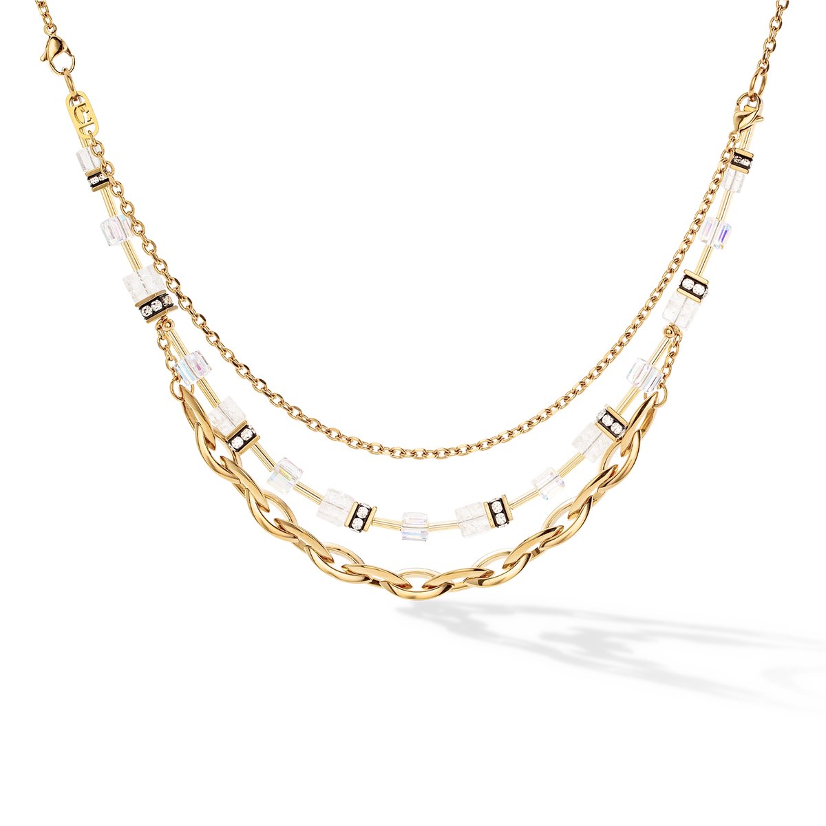 GeoCUBE® Festive Layer necklace gold and white with rock crystal cubes Discover the limitless variety and elegance of the GeoCUBE® Festive Layer necklace in elegant gold and white. This extraordinary piece of jewellery combines three perfectly coordinated layers in a fascinating design that stylishly underlines your personality. The necklace consists of a chunky navette chain, a row with a sparkling GeoCUBE® sequence with rock crystal cubes and a finer, delicate chain — all made from high-quality, gold-coloured stainless steel. The special thing about the GeoCUBE® Festive Layer necklace is its versatility. You can wear the necklace to suit your taste: either in its full splendour as a three-row statement piece or reduced and elegant as a two-row version. Whether short and close to the neck or in a longer version — this necklace adapts perfectly to your individual preferences and every occasion. Let your imagination run wild and create new looks time and time again. The GeoCUBE® Festive Layer necklace is more than just an accessory — it is your personal style companion that will make you shine through every festive season. An essential piece of jewellery for anyone looking for uniqueness and versatile elegance.