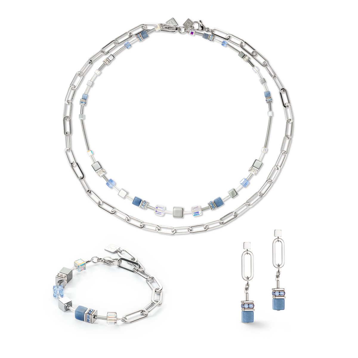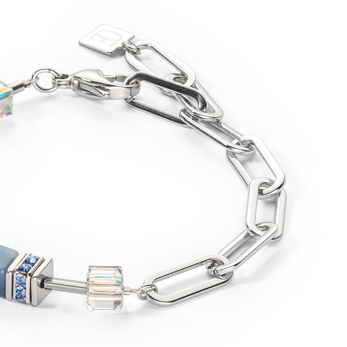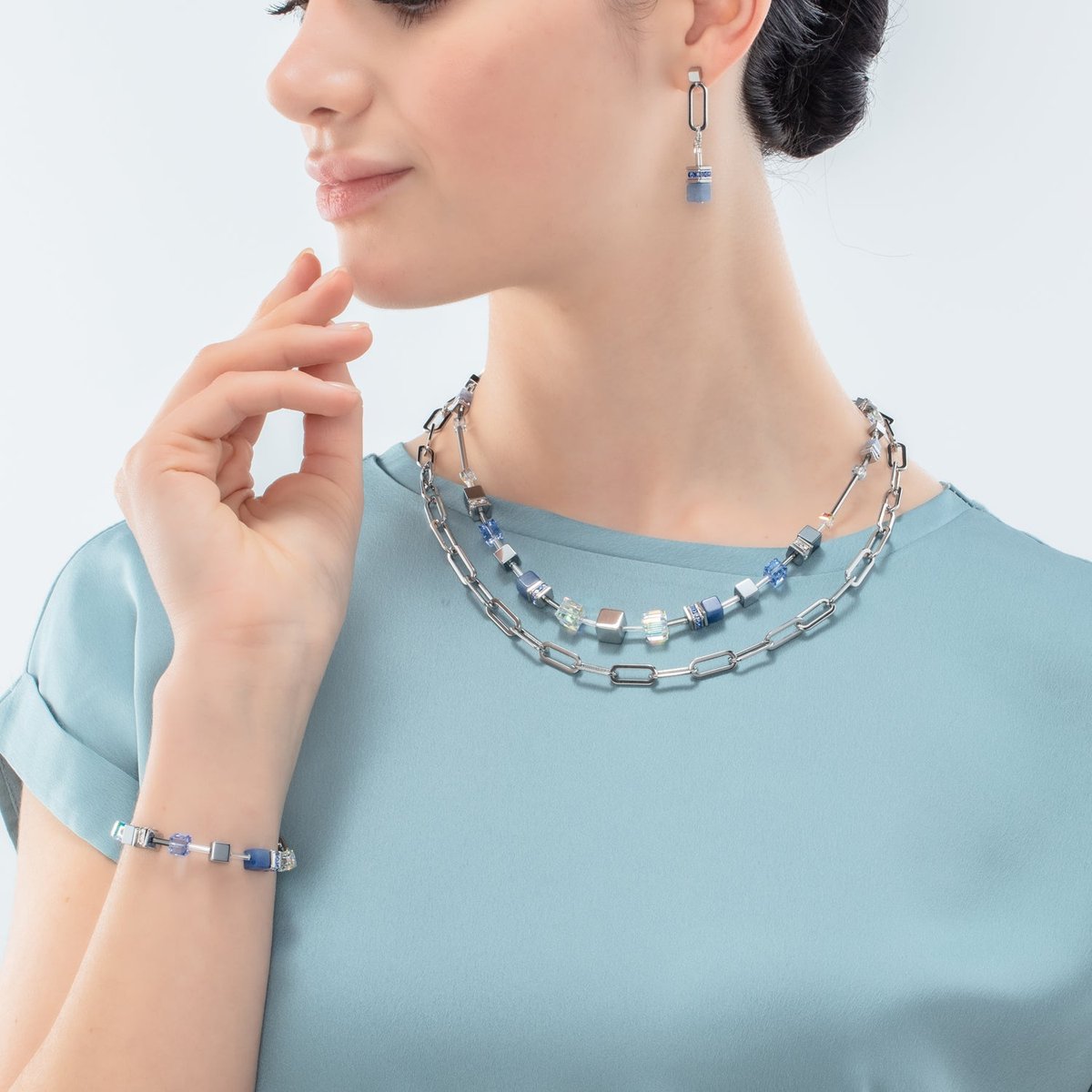The GeoCUBE® Fusion Chain bracelet in silver and blue combines classic GeoCUBES® with a smart paper-clip chain necklace in a trendy asymmetrical design.