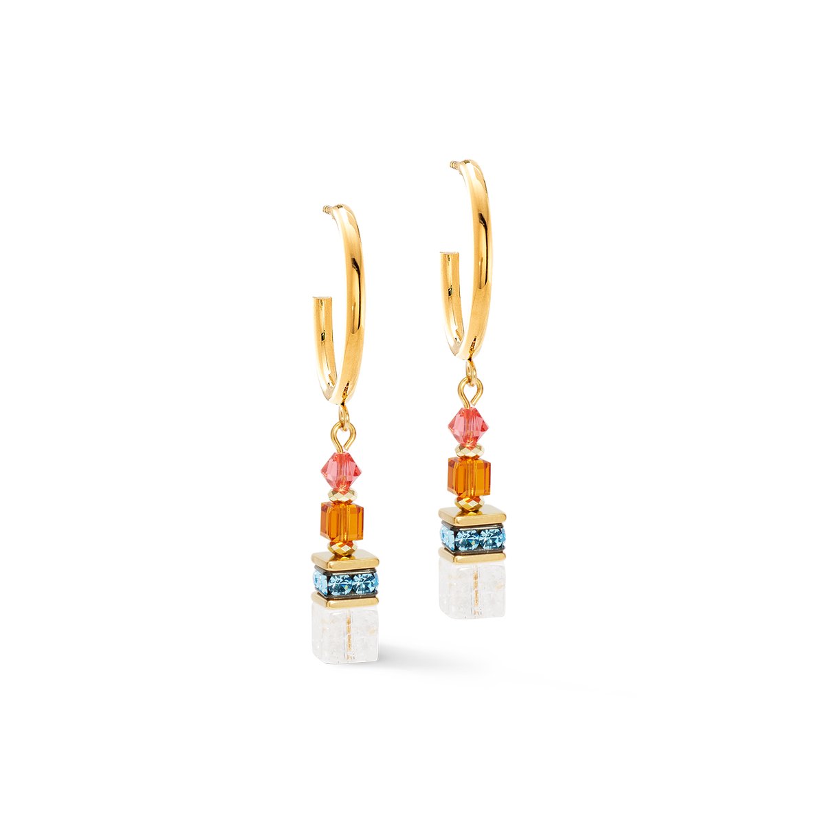 Sunny vibes for your ears — the GeoCUBE® Fusion Summer Creole gold-sunset captures the light with warm Swarovski® crystals and faceted rock crystal cubes and reflects it in sparkling orange and rosé tones. The fine gold-coloured details set accents, while the lightweight design makes it comfortable to wear. This is summer in jewellery form!