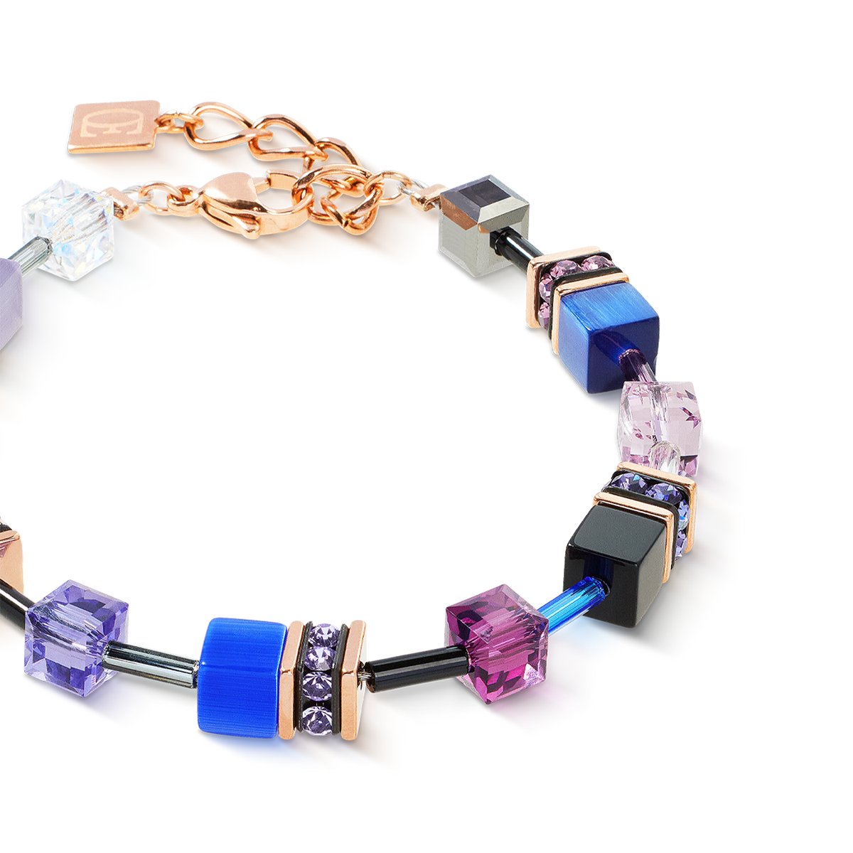 This bracelet adds a mysterious depth to any wrist. Intense colours in shades of blue and violet meet shiny details and the warm shimmer of rose gold. The classic GeoCUBE® design ensures clean lines and modern elegance. Ideal for anyone who wants to combine style with personality — perfectly complemented by the matching necklace or earrings.