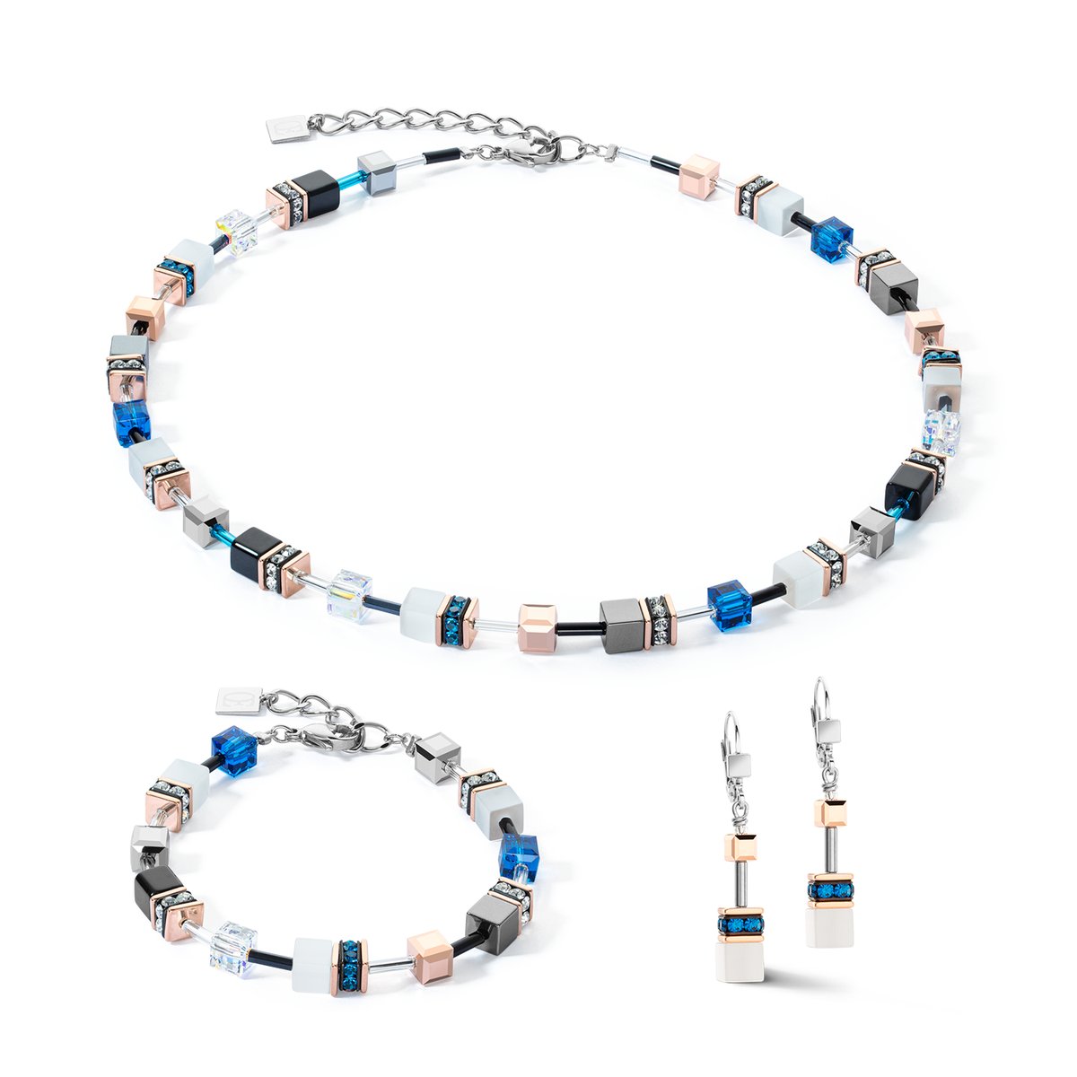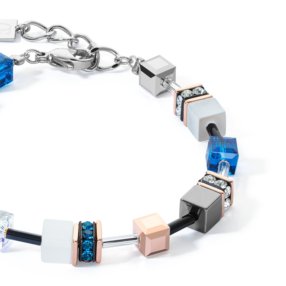This bracelet features the same rose gold, white and Capri blue GEOCUBE® beads as the necklace. The combination of colours makes for an attractive contrast and makes an elegant, striking statement.