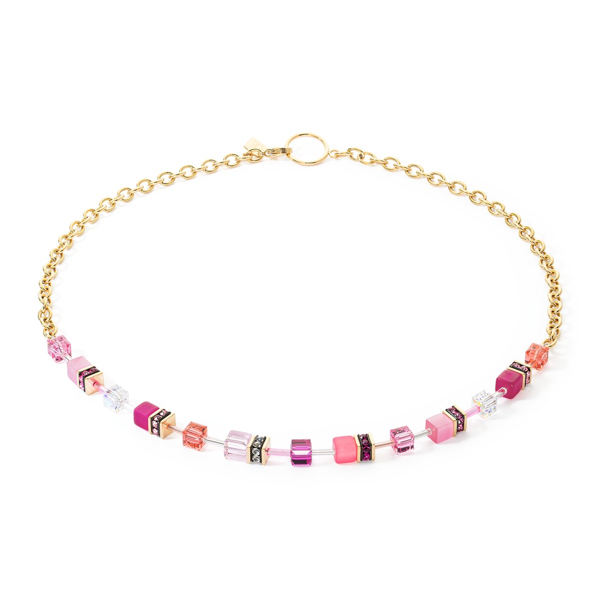 The Iconic Chain necklace gives the classic GEOCUBE® design a modern edge. Stainless steel chain gives the necklace a modern, contemporary look and forms a stunning contrast with the colourful GEOCUBE® beads. The gold and magenta colourway is striking and can be worn with a range of outfits on different occasions.