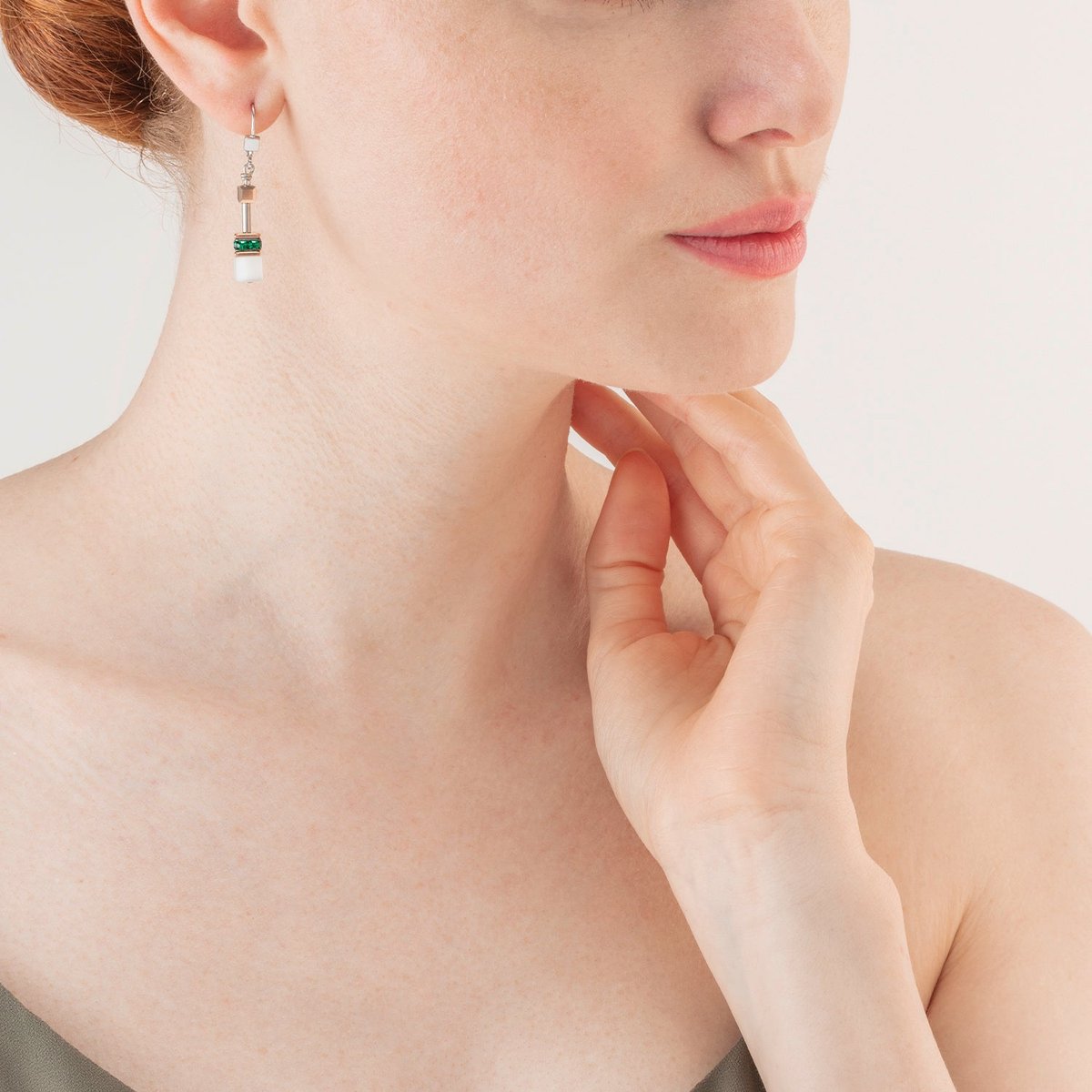 These glamorous earrings in dark green and rose gold with a white GeoCUBE® accentuate the wearer’s beauty and are the perfect choice for any occasion. They give a simple outfit a little pizzazz or round off your evening wear. Also available as a set with a matching necklace and bracelet.