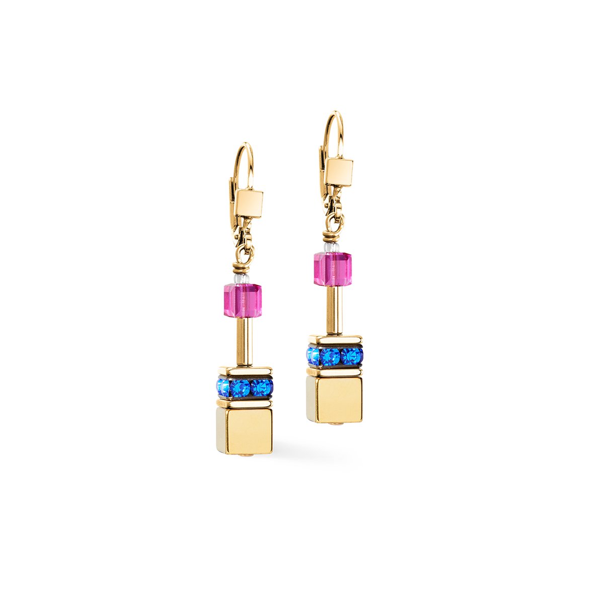 These earrings combine the iconic GeoCUBE® design with a touch of the rainbow. Radiant crystals and gold-coloured hematite with a titanium oxide finish create a modern, colourful elegance. Whether worn individually or as a set with a necklace and bracelet — an expressive gift for anyone who wants to show their colours.