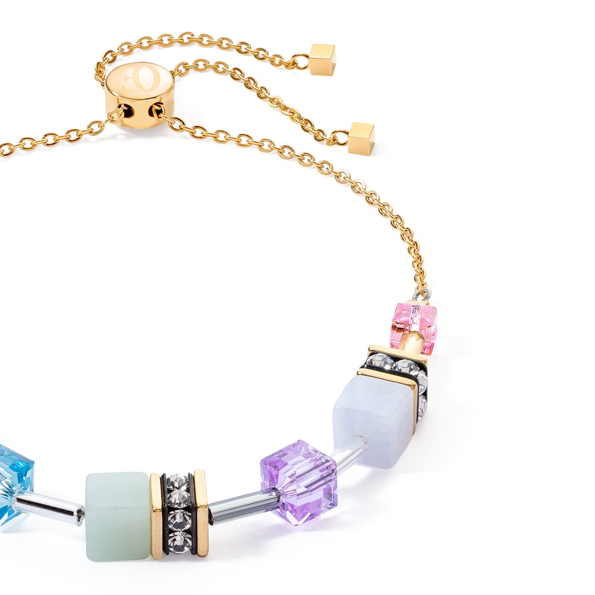 GeoCUBE® bracelet with materials straight from nature. Amazonite, green aventurine and pale blue chalcedony in combination with sparkling Swarovski crystals with a gold chain and practical sliding clasp.