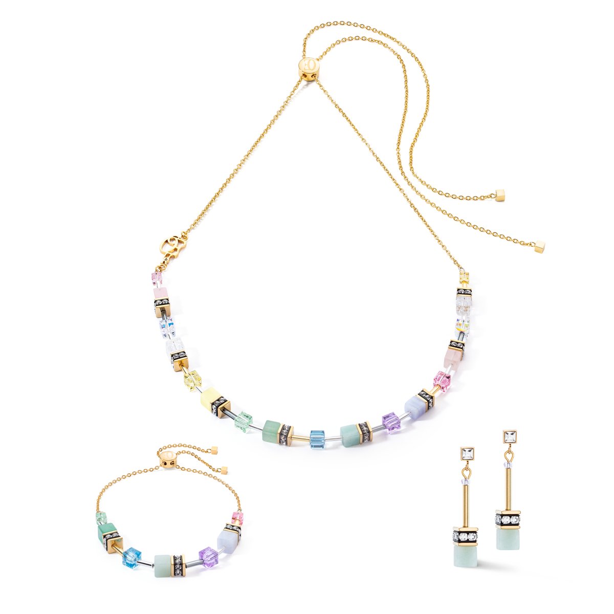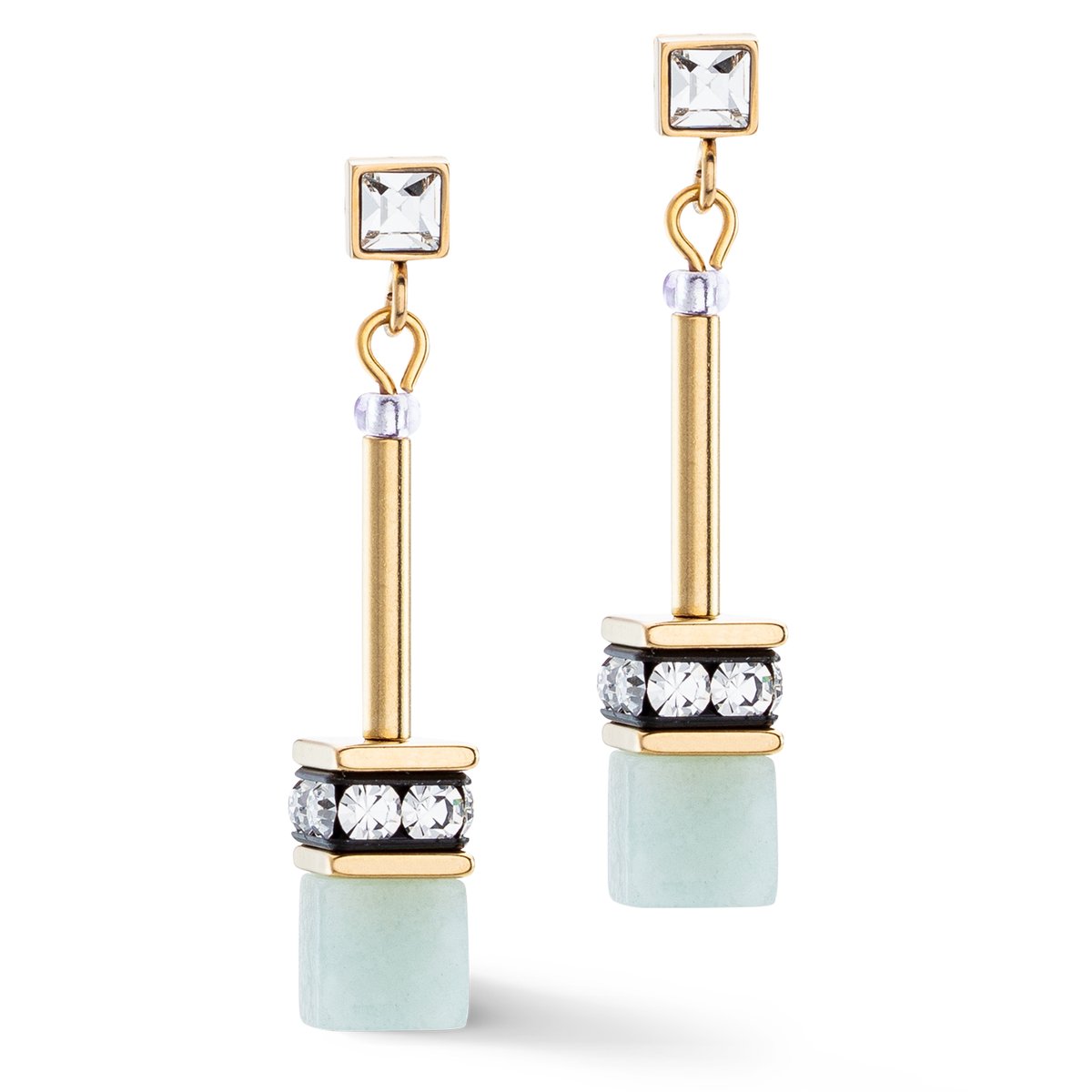 Beautiful GeoCUBE® earrings with a cube of amazonite and sparkling crystals, worn individually or as a set with a bracelet and necklace, will attract everyone’s attention.