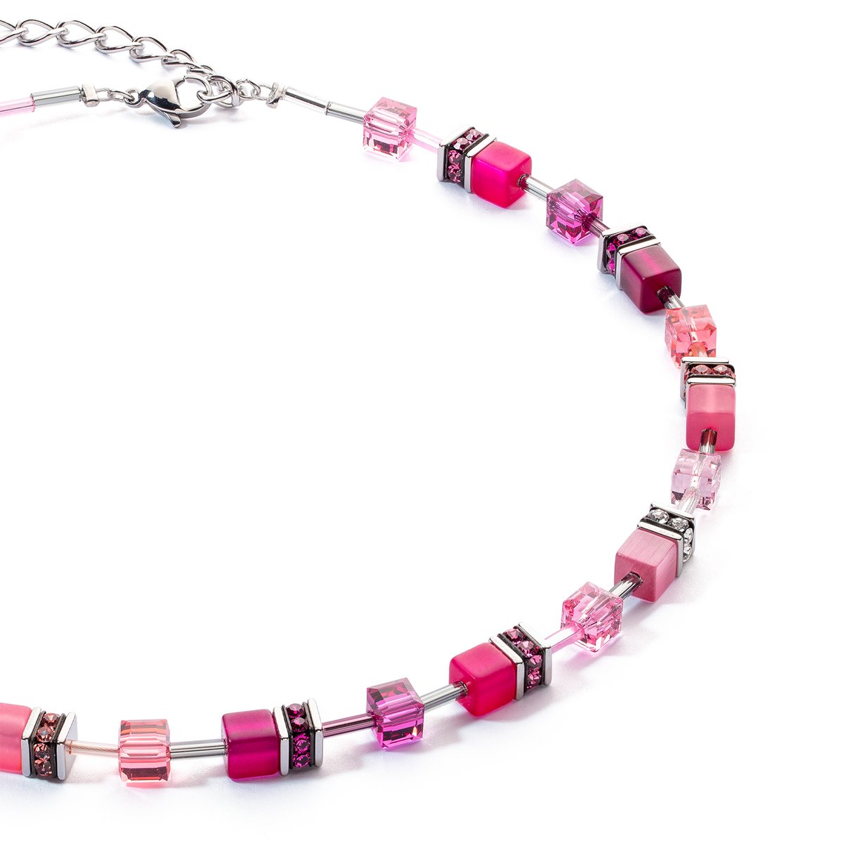 Viva Magenta! We’re paying homage to this year’s fashionable colour with a range whose name says it all. Sophisticated Swarovski® crystals and vibrant GeoCUBES® come together in a distinctive colourway, transforming this short necklace into the season’s must-have accessory. Pure joie de vivre – viva magenta! The stainless steel clasp allows the length to be adjusted by 6 cm.Complement this style with the Viva Magenta bracelet and earrings.