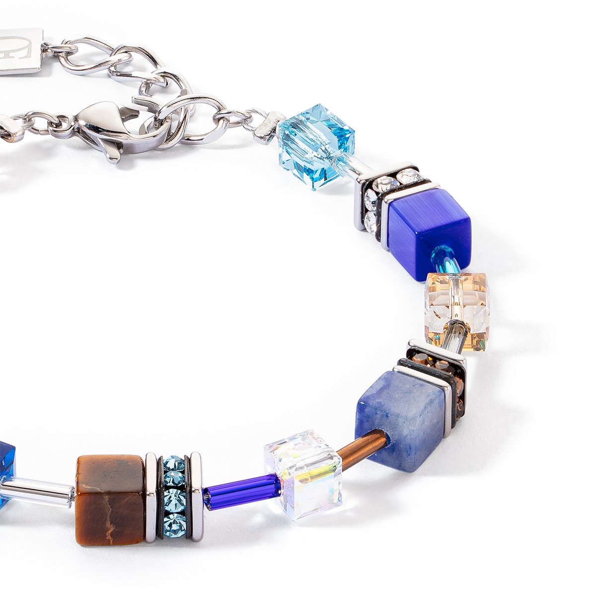GeoCUBE® Iconic Precious bracelet blue-brown — elegance with meaningful gemstones The GeoCUBE® Iconic Precious bracelet in blue-brown combines the fascinating beauty of natural gemstones with a modern, stylish design. This bracelet is made from the same exquisite materials as the matching necklace: tiger’s eye, sodalite, blue aventurine and landscape jasper — each stone with its own unique meaning and energy. Tiger’s eye: symbolises courage and protection, strengthens self-confidence and promotes inner peace. Sodalite: Symbolises clarity and rationality, supports communication and self-expression. Blue aventurine: A stone of serenity, helps to reduce stress and find inner balance. Landscape jasper: Promotes earthiness, stability and a sense of security. The combination of deep blue tones and earthy brown shades makes this bracelet a real eye-catcher, adding a touch of elegance and meaning to your wrist. Wear it as a stylish statement or as a powerful symbol of your inner strength and harmony. The GeoCUBE® Iconic Precious Bracelet Blue-Brown is not just a piece of jewellery, but also an expression of your personality.