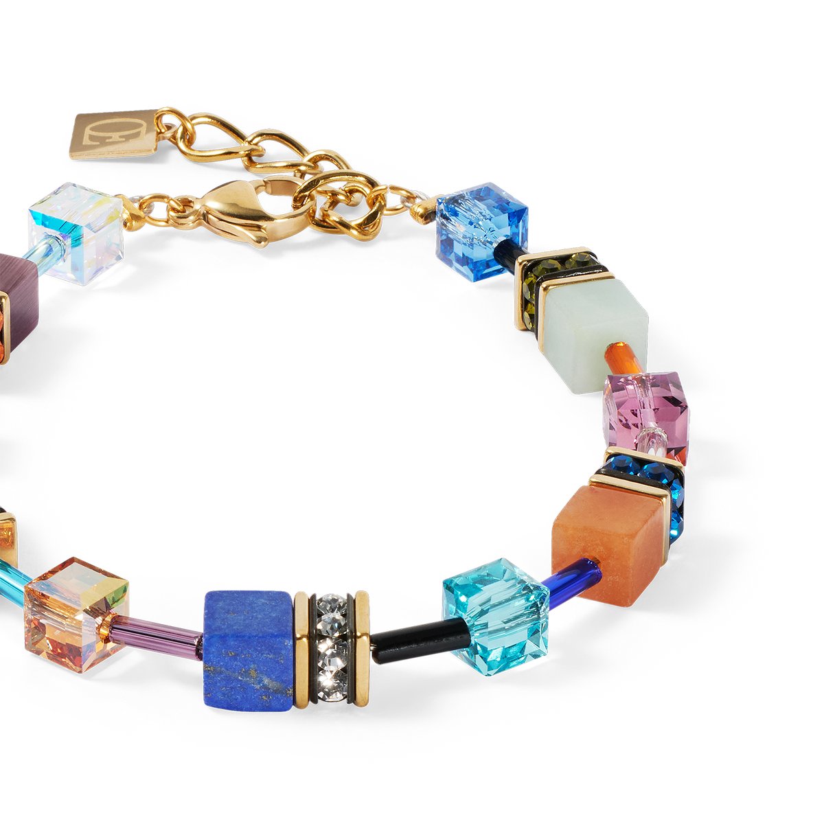 Dynamic, expressive, unique — the GeoCUBE® Iconic Precious bracelet multicolor motion plays with the exciting colour combination of lapis lazuli, nephrite, amazonite and red aventurine. Sparkling Swarovski® crystal cubes add extra radiance, while golden stainless steel elements elegantly round off the design. A vibrant statement piece for anyone who loves colour.
