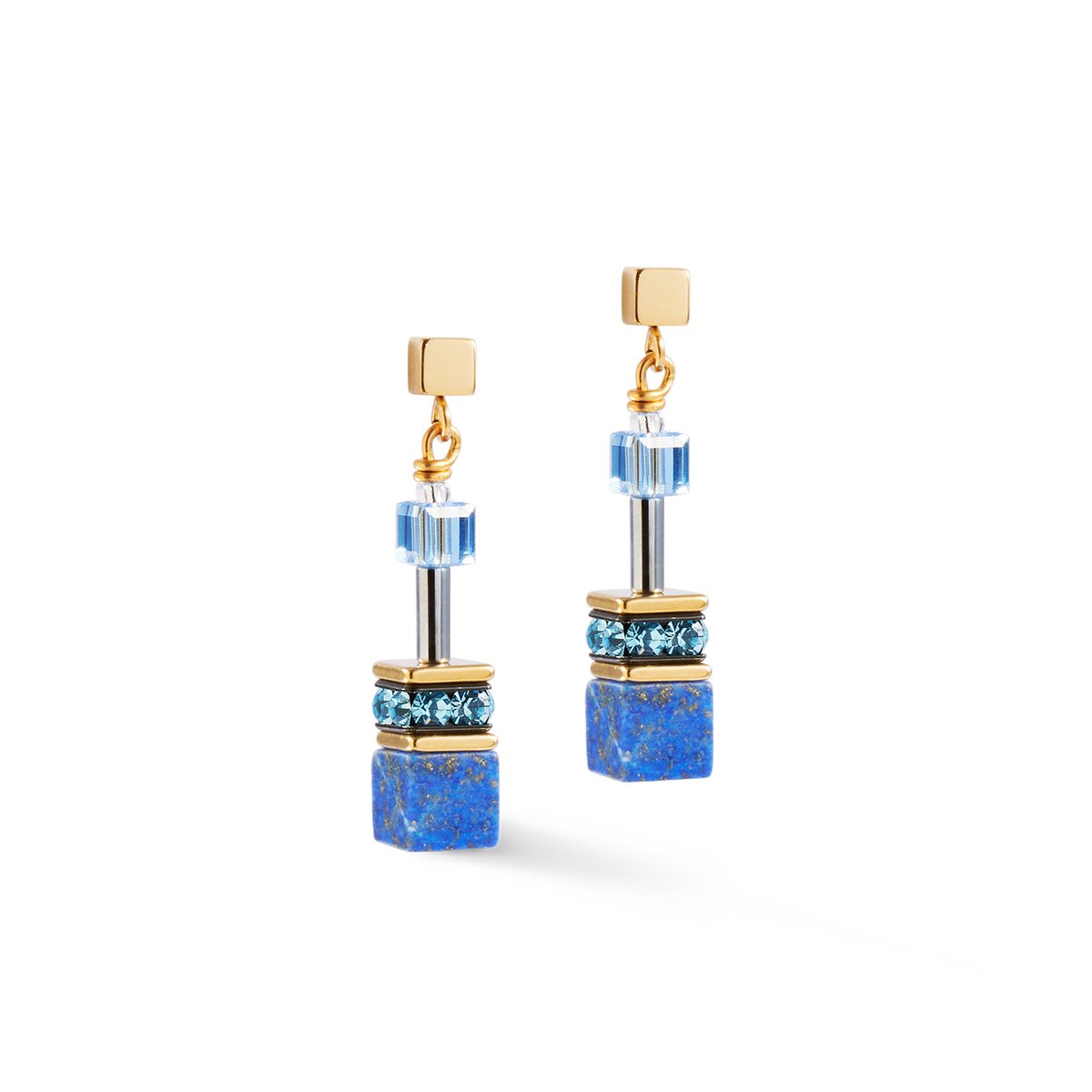 Classic, profound, timeless — the GeoCUBE® Iconic Precious earrings blue combine the powerful elegance of lapis lazuli with sparkling Swarovski® crystal cubes. The intense blue tones symbolise calm and strength, while precious stainless steel elements in gold provide a luxurious contrast. Perfect for style-conscious looks with a modern twist.