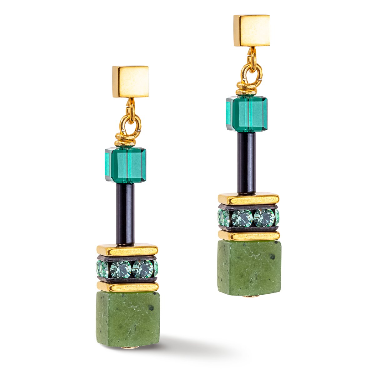 Gloriously green, these unusual GeoCUBE® earrings are made from natural stones and give their wearer a sense of harmony.
