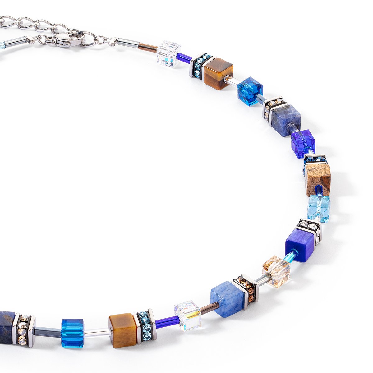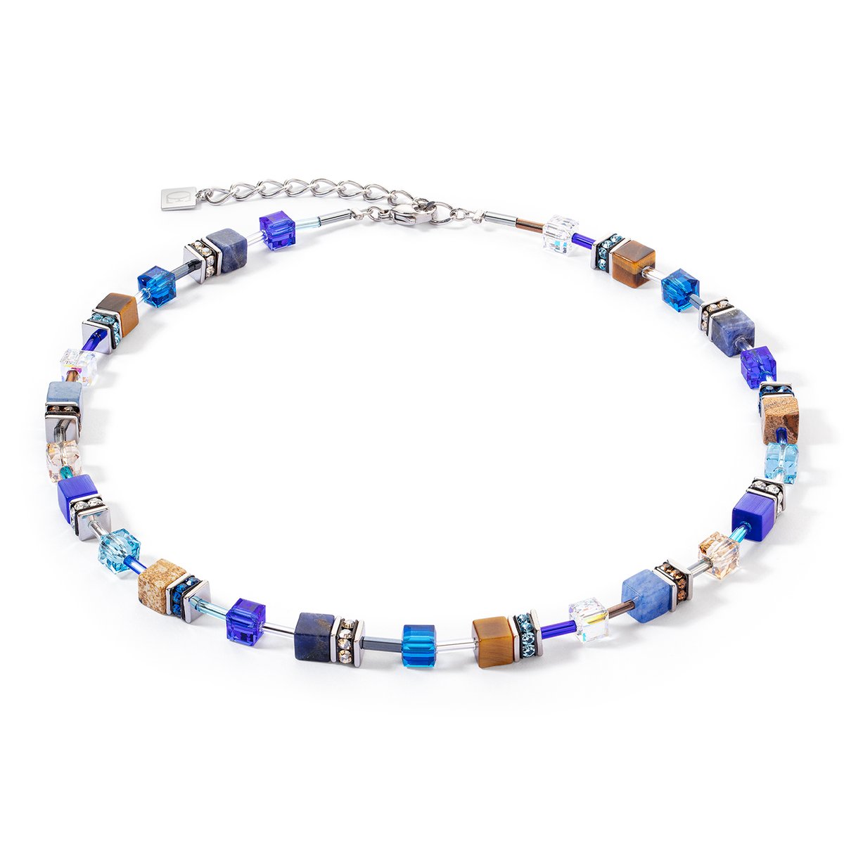 GeoCUBE® Iconic Precious Necklace Blue-Brown — Powerful elegance with gemstones The GeoCUBE® Iconic Precious Necklace in blue-brown harmoniously combines elegant colours with the fascinating power of natural gemstones. This exquisite piece of jewellery consists of hand-picked GeoCUBES® made from tiger’s eye, sodalite, blue aventurine and landscape jasper — each stone carries a special meaning and symbolises unique energies. Tiger’s eye: Known as a stone of courage and protective power, tiger’s eye is said to strengthen self-confidence and promote inner peace. Sodalite: This stone symbolises clarity and rationality and supports communication and self-expression. Blue aventurine: A stone of serenity and inner peace that helps to reduce stress and find balance. Landscape jasper: The stone of connection to the earth, it promotes stability and helps you to feel grounded and secure. With its unique colour play of deep blues and warm browns, the GeoCUBE® Iconic Precious necklace perfectly accentuates your personality. It is not only a stylish accessory, but also an expression of inner strength and balance. Whether as a special gift or as a personal lucky charm — this necklace gives every outfit a special meaning and remains a timeless highlight in your jewellery collection.