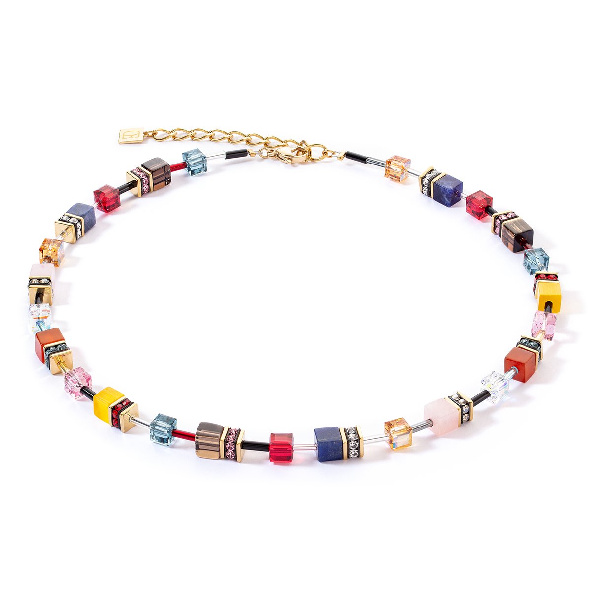 GeoCUBE® Iconic Precious Necklace Energy — Powerful colour accents with meaningful gemstones The GeoCUBE® Iconic Precious Necklace Energy is a vibrant statement of colours and gemstones that not only enhances your outfits, but also positively influences your energy. This unique piece of jewellery combines the power of four meaningful gemstones in a harmonious composition: Smoky quartz: A stone of clarity and grounding that helps to reduce negative energies and find inner balance. Sodalite: Symbolises clarity and rationality, supports communication and promotes self-expression. Carnelian: Known as the stone of vitality and zest for life, carnelian boosts motivation and brings passion into your life. Rose quartz: The stone of love and compassion, helping to promote emotional healing and create harmony. The colourful GeoCUBES® made from these genuine gemstones are artfully set in a necklace that serves as a radiant eye-catcher both in everyday life and on special occasions. The combination of intense colours and the deep meanings of the stones gives this necklace a special radiance and energy. With the GeoCUBE® Iconic Precious necklace Energy, you are not only wearing a fashion accessory, but also a piece of positive energy and symbolic power. A must-have for anyone who appreciates jewellery with deep meaning and stylish elegance.