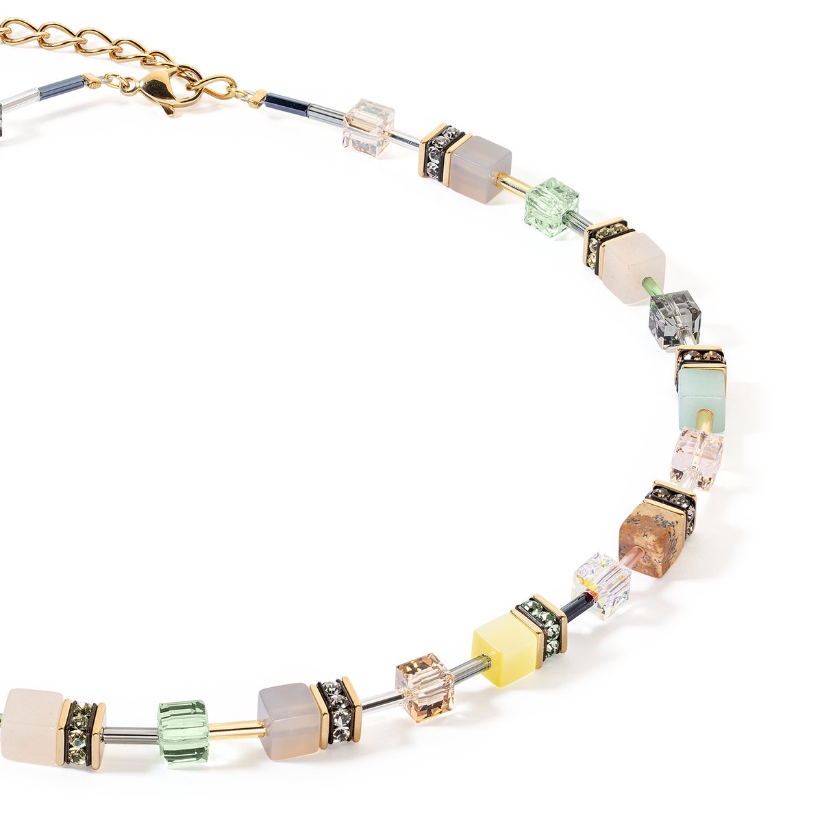 Add Mother Nature’s subtle colours to your outfit with the GEOCUBE® Iconic Precious necklace in gentle multicoloured shades. Precious stones including agate, pink aventurine, amazonite and landscape jasper come together with subtle Swarovski® crystals in this harmonious multicoloured design. Each stone has a unique beauty which complements the others perfectly. The subtle colours are reminiscent of delicate pastels and lend the necklace a feminine look.