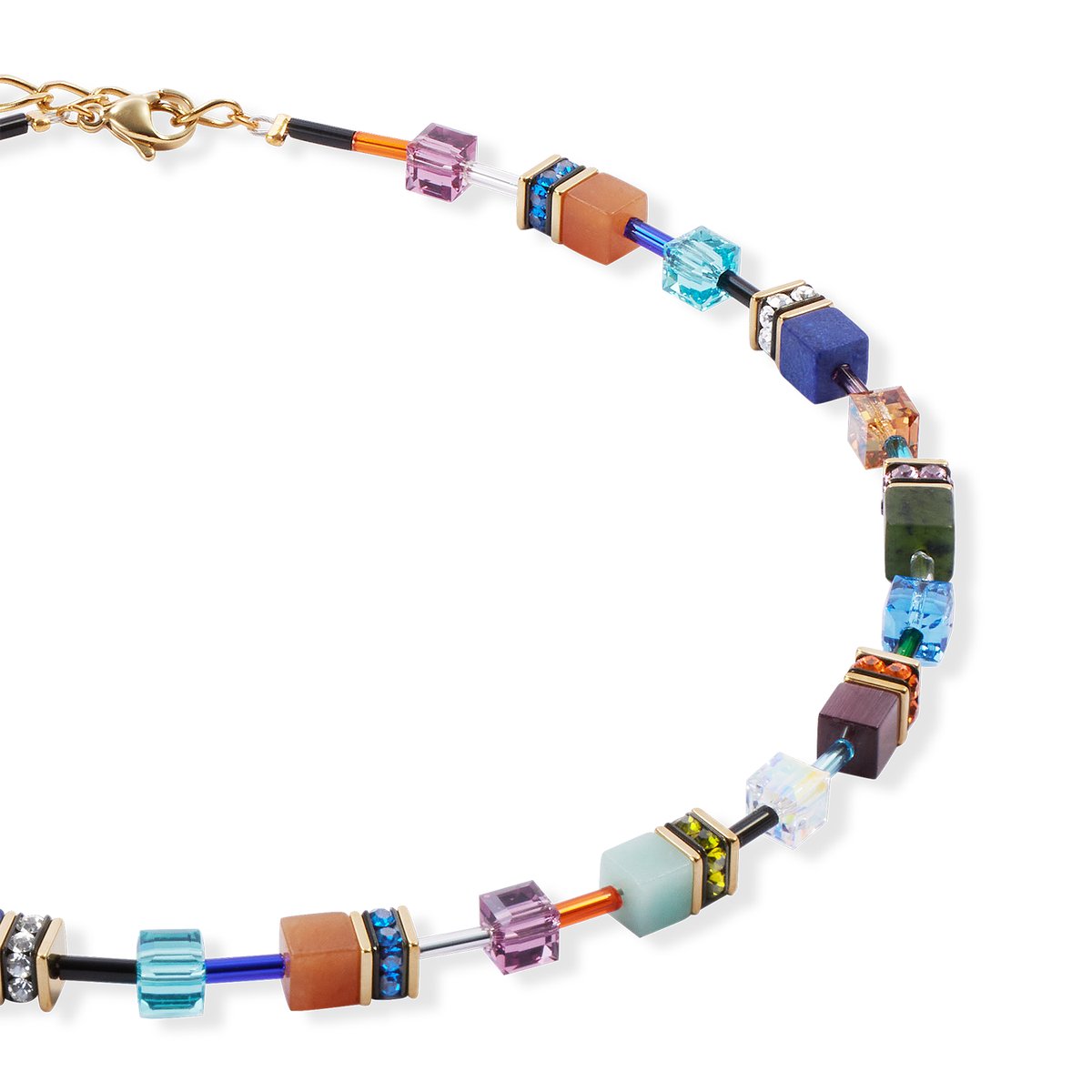 Vibrant colours, harmoniously combined — the GeoCUBE® Iconic Precious necklace multicolor motion features an expressive mix of lapis lazuli, nephrite, amazonite and red aventurine. The radiant Swarovski® crystal cubes provide additional luminosity, while the warm stainless steel in gold creates an elegant frame.