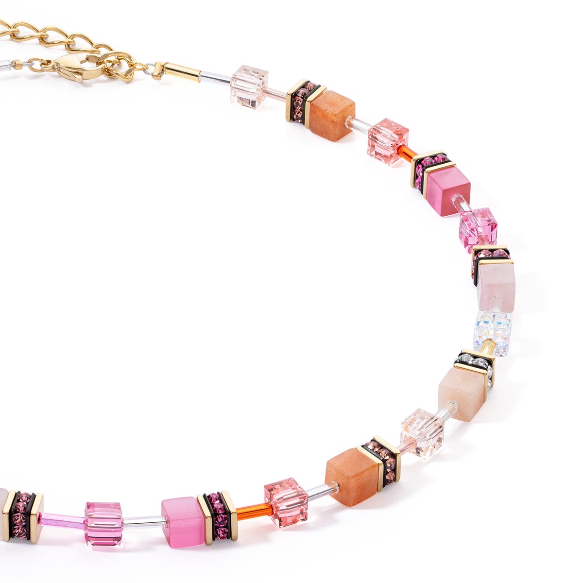 The GeoCUBE® Iconic Precious necklace in pink-orange is a truly unique piece of jewellery that fascinates with its vibrant colours and natural elements. This necklace combines the modern design of GeoCUBES® with the beauty of natural stones such as red aventurine, pink aventurine and rose quartz. The whole is complemented by golden accents.