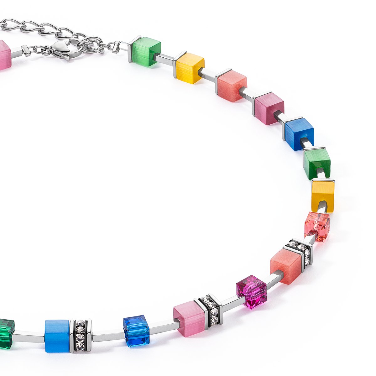 The timeless beauty of the GeoCUBE® Iconic Pure necklace in rainbow-silver is reflected in the masterful combination of the classic GeoCUBE® Iconic sequence with a modern, purist sequence.The GeoCUBE® Iconic Pure bracelet and the Brilliant Square small silver crystal ear studs are available to match.