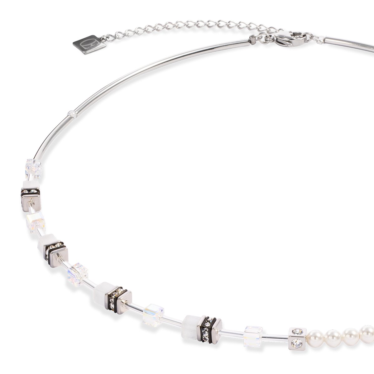 Delicate, modern, absolutely iconic — the GeoCUBE® Mini Fusion Pearls necklace silver-white is the delicate reinterpretation of a classic. Crystal Pearls by Swarovski® meet precisely cut GeoCUBE® elements and fine stainless steel in silver. The soft white tones lend the piece of jewellery an elegant lightness, while the minimalist design creates a modern, stylish look. Perfect for anyone who loves timeless elegance with a touch of innovation.