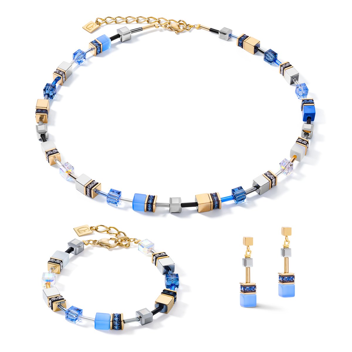COLOURS INSPIRED BY NATURE. Handmade using haematite, sparkling Swarovski® crystals, golden stainless steel and synthetic tiger’s eye, this necklace from the famous GeoCUBE® collection combines sunny golds with bright blues. Oh-so elegant worn with one or two delicate layering necklaces.